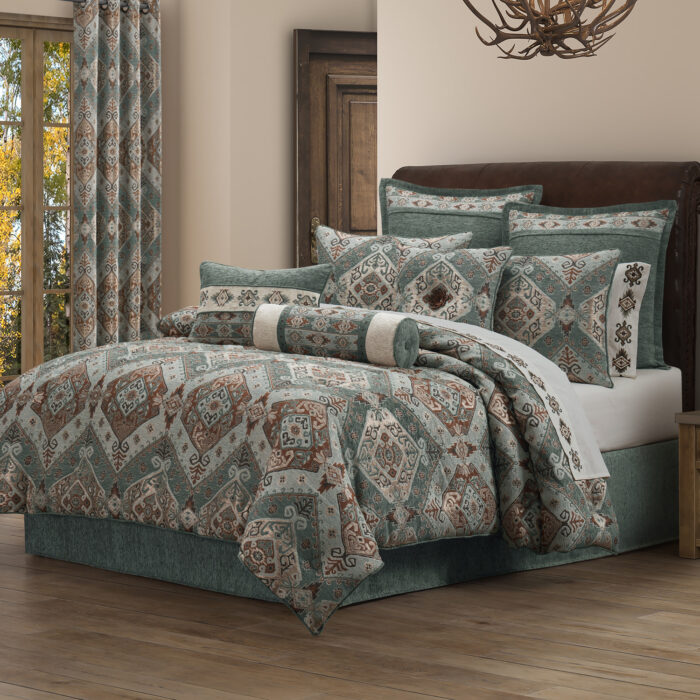 • A turquoise comforter set is the easiest way to incorporate this color into your bedroom. Look for sets that include matching pillow shams and bed skirts for a complete look. Many comforter sets also come with additional accessories like decorative pillows and throws, allowing you to layer textures and create a rich, multi-dimensional design.