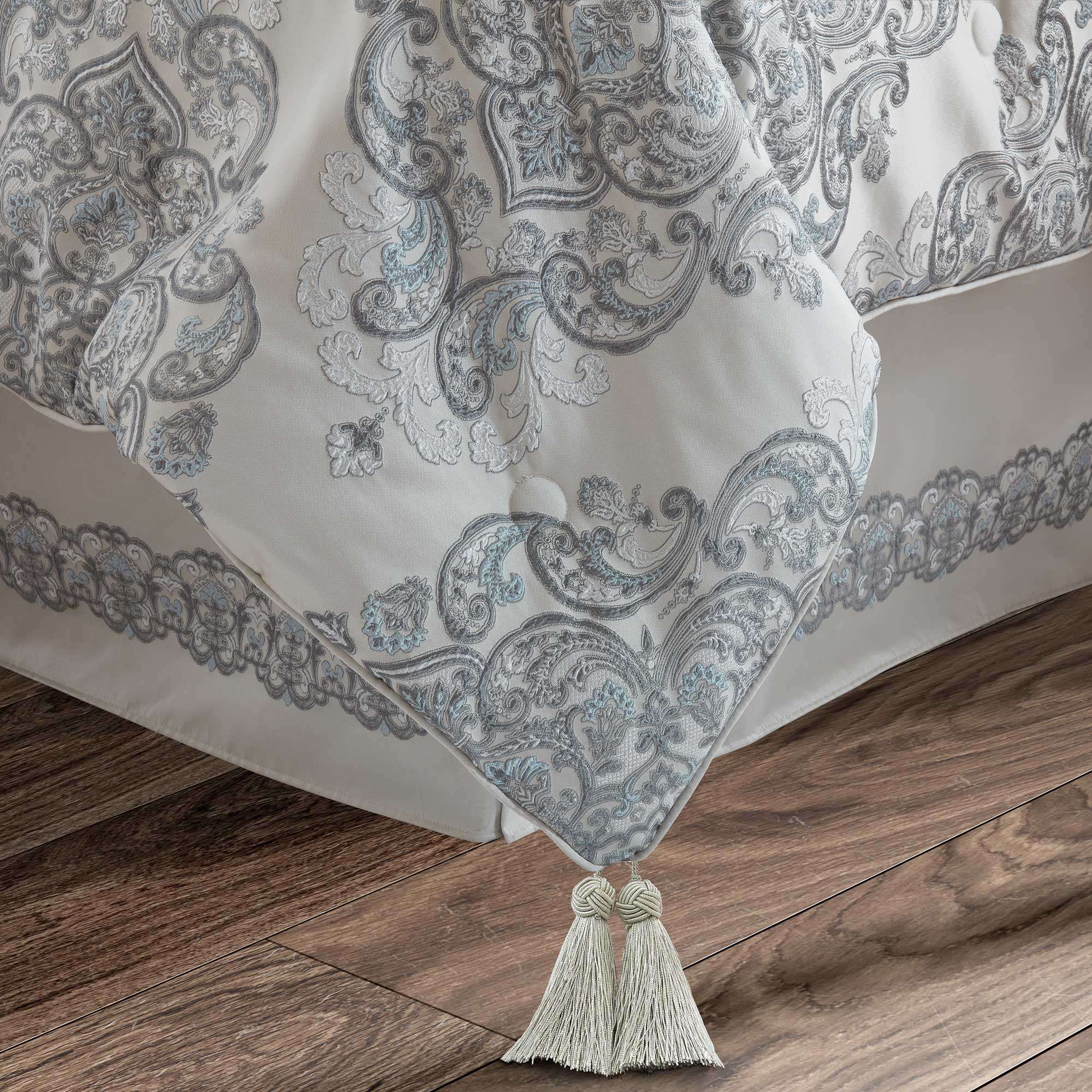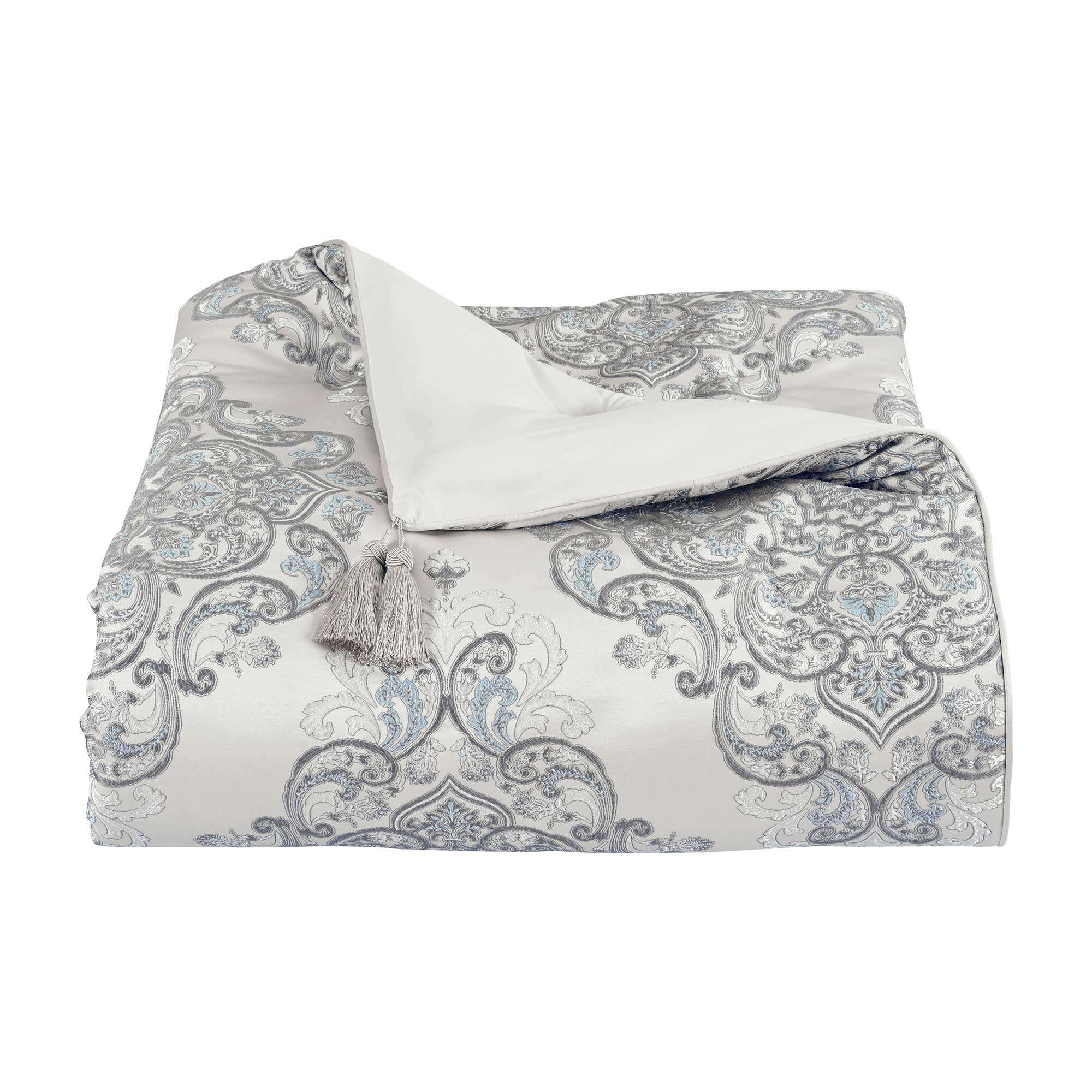 The Adagio 4 Piece Comforter Set Is Designed To Capture Modern Elegance. The Large Scale Medallion Pattern Is Delicately Woven To Have A 3-Dimensional Weave In Shades Of Sterling Silver And French Blue On A Creamy Matte Satin Ground. The Comforter Is Piped All Around And Double Tassels Adorn The Front Corners For Added Detail. Paired With Matching Shams And A Bedskirt That Is Trimmed With A Scroll Design And A Woven Band That Pulls The Beauty All Together. The Adagio Set Is Sure To Add A Touch Of Luxury And Updated Elegance To Your Bedroom Decor. Pair This Bedding Collection With The Adagio Throw Pillows, Shams, And Window Treatments For A Complete Look.
