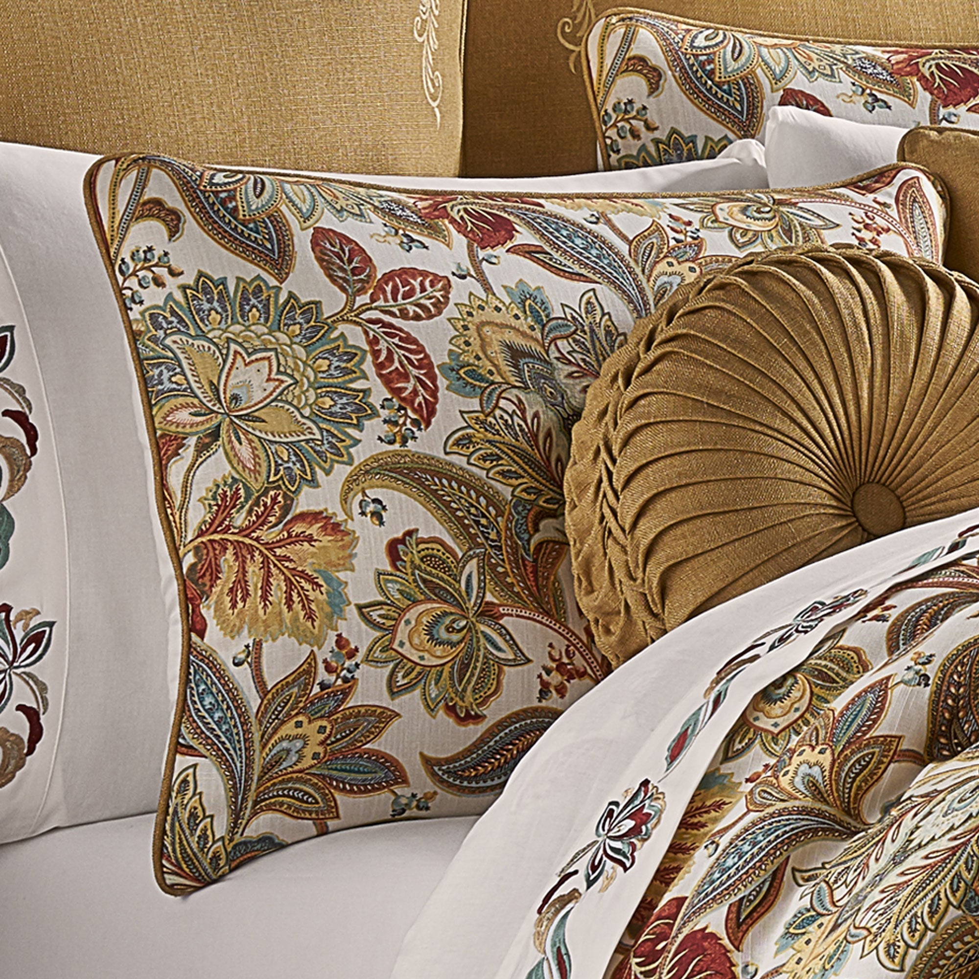 August is a beautifully printed multicolored floral Jacobean design. The colors include tones of sunkissed colors and teals highlighted by a cream ground. The oversized comforter is embellished with 1/4” woven solid gold piping.