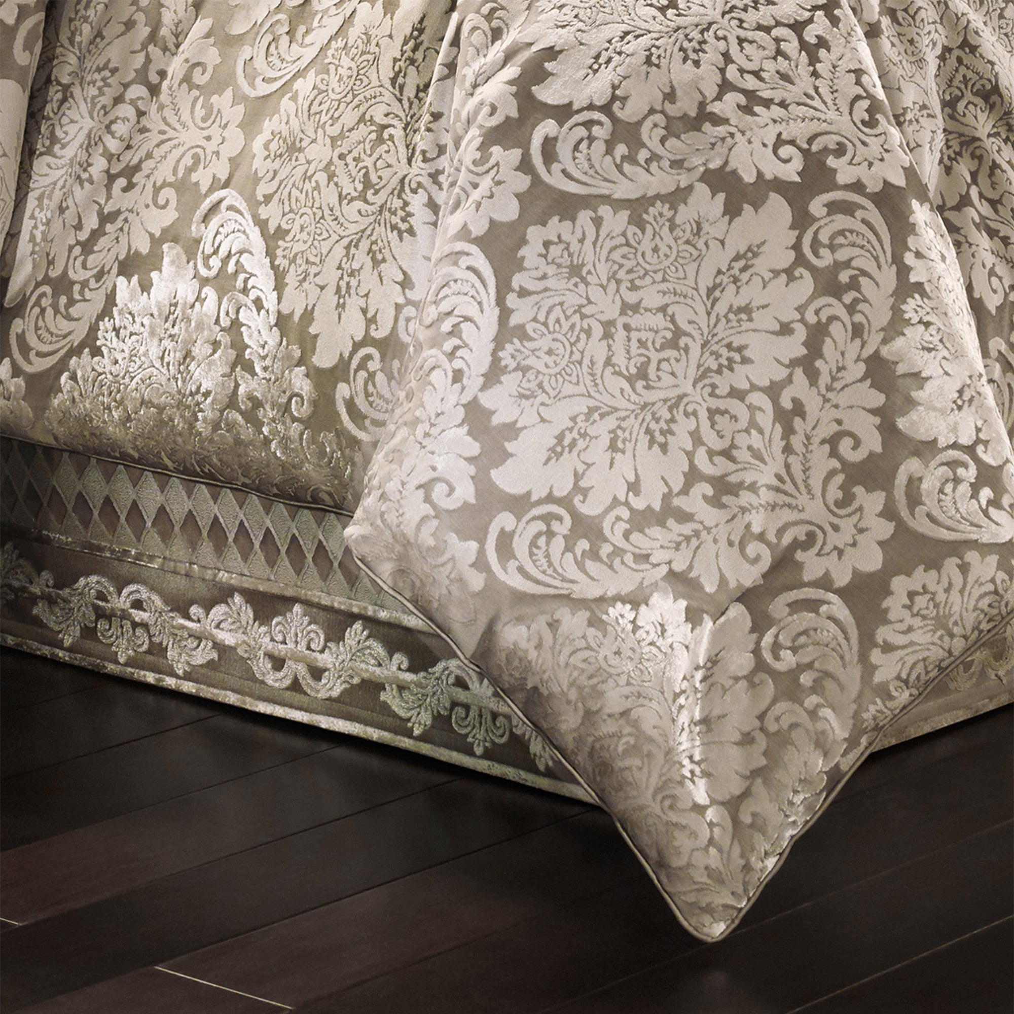 Shimmering tones of a warm khaki and antique ivory are combined to create this luxury velvet ensemble. The comforter and pillow shams are cut and sewn from the classical large scaled damask. The bedskirt and accessory pillows add an opulent diamond coordinate, framed with a scroll border all created in the luxurious velvet fabric.