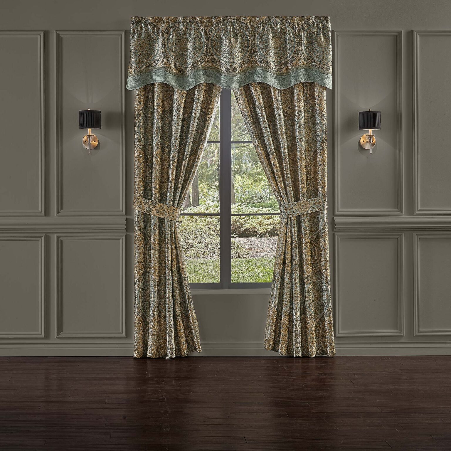 The Dorset Window Valance Is Exquisite With Its Fine Details. The Classic Scallop Style Valance Features A Woven Chenille Medallion In Tones Of Spa, Beige And Granite. Beautifully Finished With A Dyed To Match Crystal Tassel Fringe. The 3″ Header And 3″ Rod Pocket Make The Valance Easy To Hang. Pair This Valance With The Dorset Window Panels And Bedding Set For A Stunning Update To Any Room.