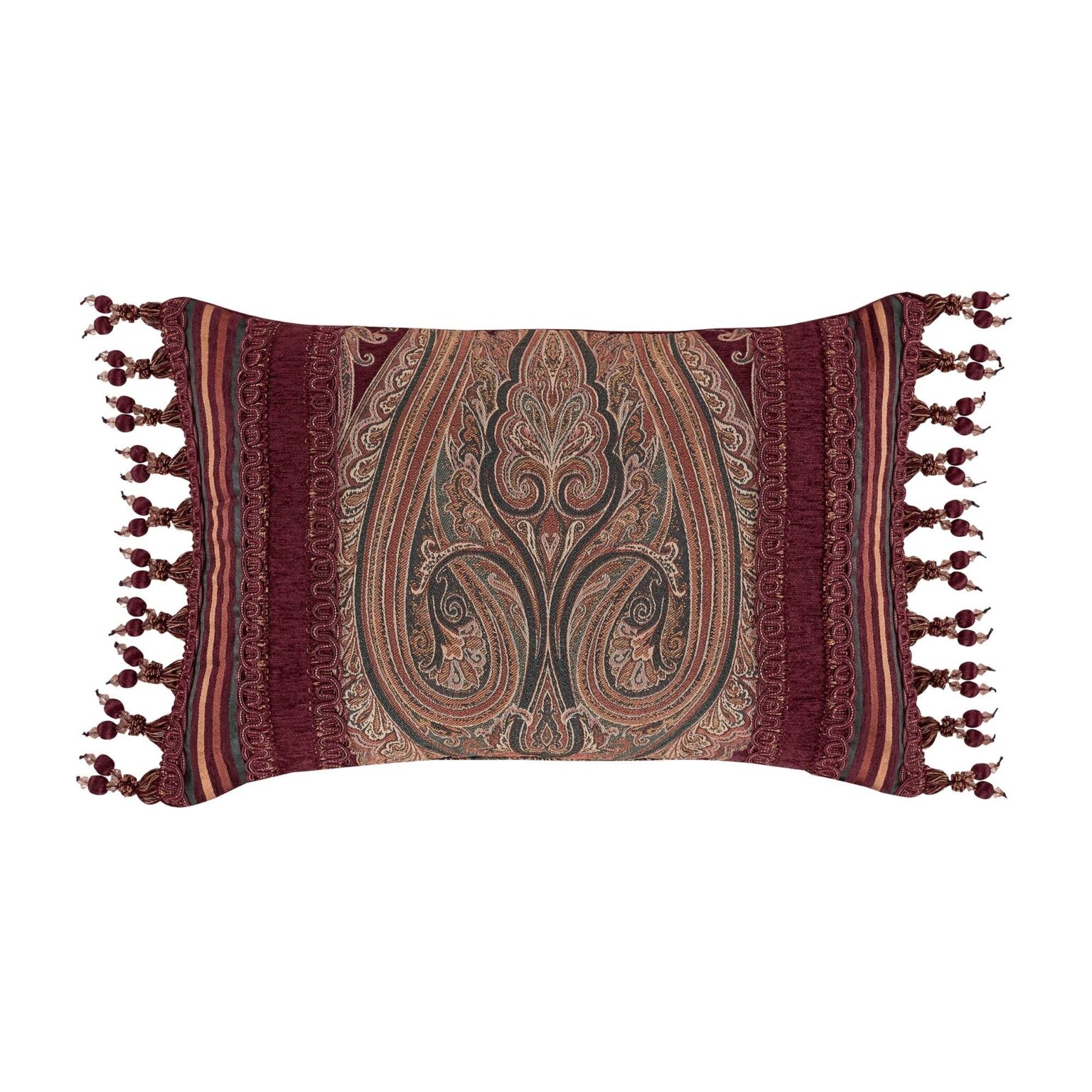 The Garnet Boudoir Throw Pillow Is Pieced With A Beautiful Jacquard And Striped Chenille Designer Fabric On Either Side. The Pillow Is Embellished With A Lovely Beaded Tassel Fringe And Braided Trim Detail, Creating The Perfect Finishing Touch To This Traditional Luxury Design. Pair This Elegant Accent Pillow With The Garnet Bedding Set By JQueen NY For A Complete Look.