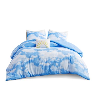 Sleep in the serene and lofty comfort of the Intelligent Design Aira Cloud Printed Comforter Set. This comforter features a fluffy cloud print against a bright blue sky background to create a bright and dreamy look. The 2 matching shams (1 in Twin/TwinXL) spread the beautiful sky imagery to the head of bed, while the oblong pillow completes the cloud bedding set. An antimicrobial treatment provides built-in freshness protection, reduces growth of odor causing bacteria, and keeps the fabric newer, longer. Machine washable for easy care, this cloud print comforter set brightens up your bedroom and uses hypoallergenic filling to provide exceptional warmth and comfort. This cloud comforter set may come in rolled or compressed packing and will need to be fluffed up. Use a steam iron to help remove wrinkles easier.