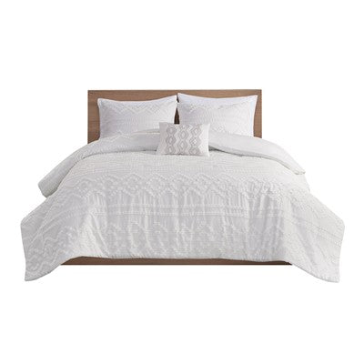 The Intelligent Design Annie Solid Clipped Jacquard Comforter Set offers a chic modern update to your bedroom decor. The solid off white comforter features a clipped jacquard design on the seersucker base fabric that creates a 3D look. Matching shams (1 in Twin/TwinXL) coordinate perfectly with the comforter, completing the contemporary comforter set. This bedding set is OEKO-TEX certified, meaning it does not contain any harmful substances or chemicals, and uses an antimicrobial treatment that provides built-in freshness protection, reducing the growth of odor causing bacteria to keep fabric lasting longer.