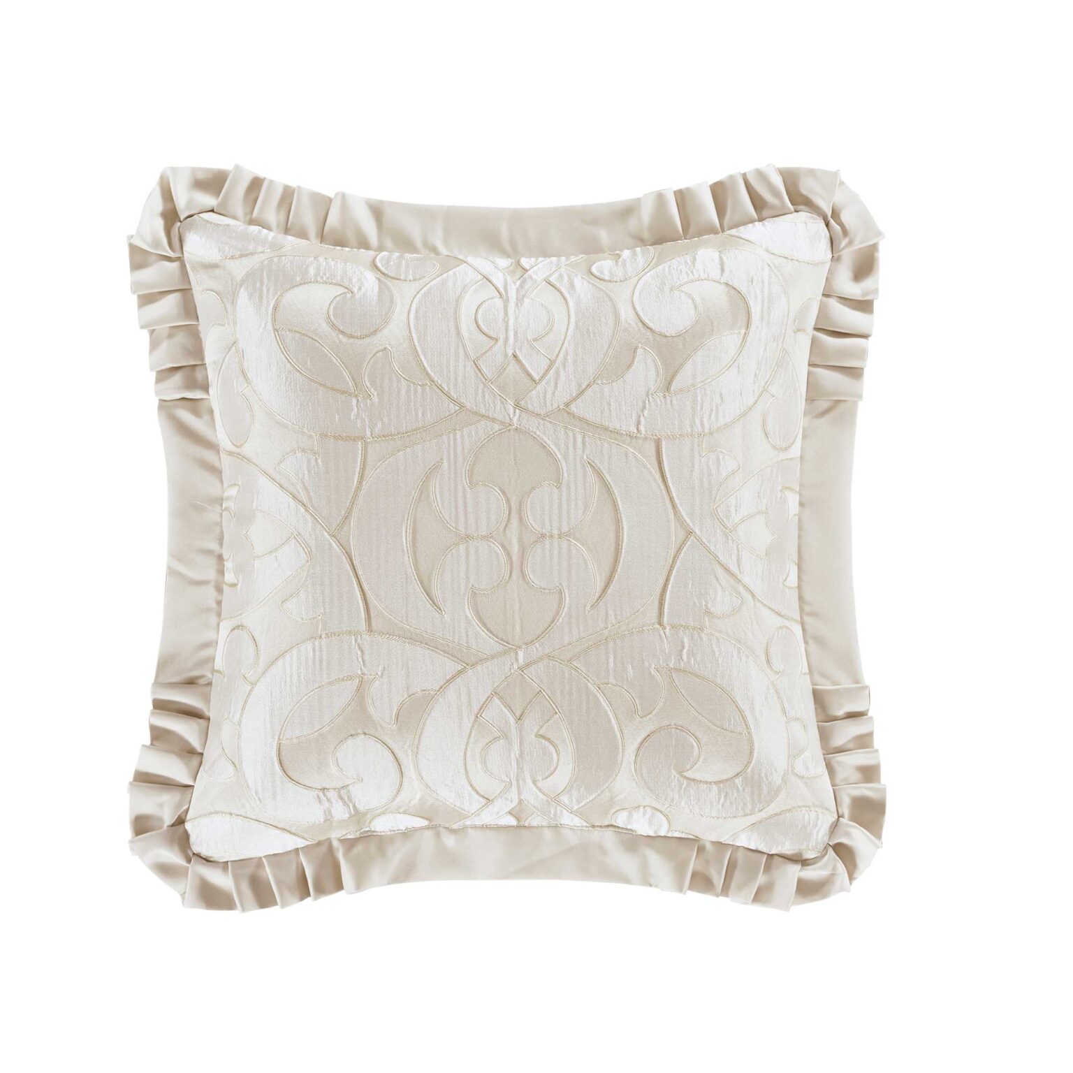 A Generous 20” Embellished Square Throw Pillow Is A Perfect Decorating Accessory Not Only To Complete The Bedding Ensemble But As An Elegant Accent In Other Areas Of The Home. Each Pillow Is Cut And Sewn Exactly The Same. Showcasing The Large Ivory Damask On One Side And A Stunning Geometric Pattern On The Other For Added Versatility. A Lovely Pleated Flange Finishes The Pillow For A Tasteful Decorator’S Touch. Pair This Pillow With The La Boheme Bedding Set By JQueen NY For An Updated Luxe Look.