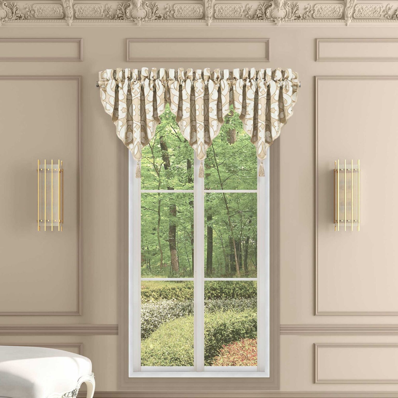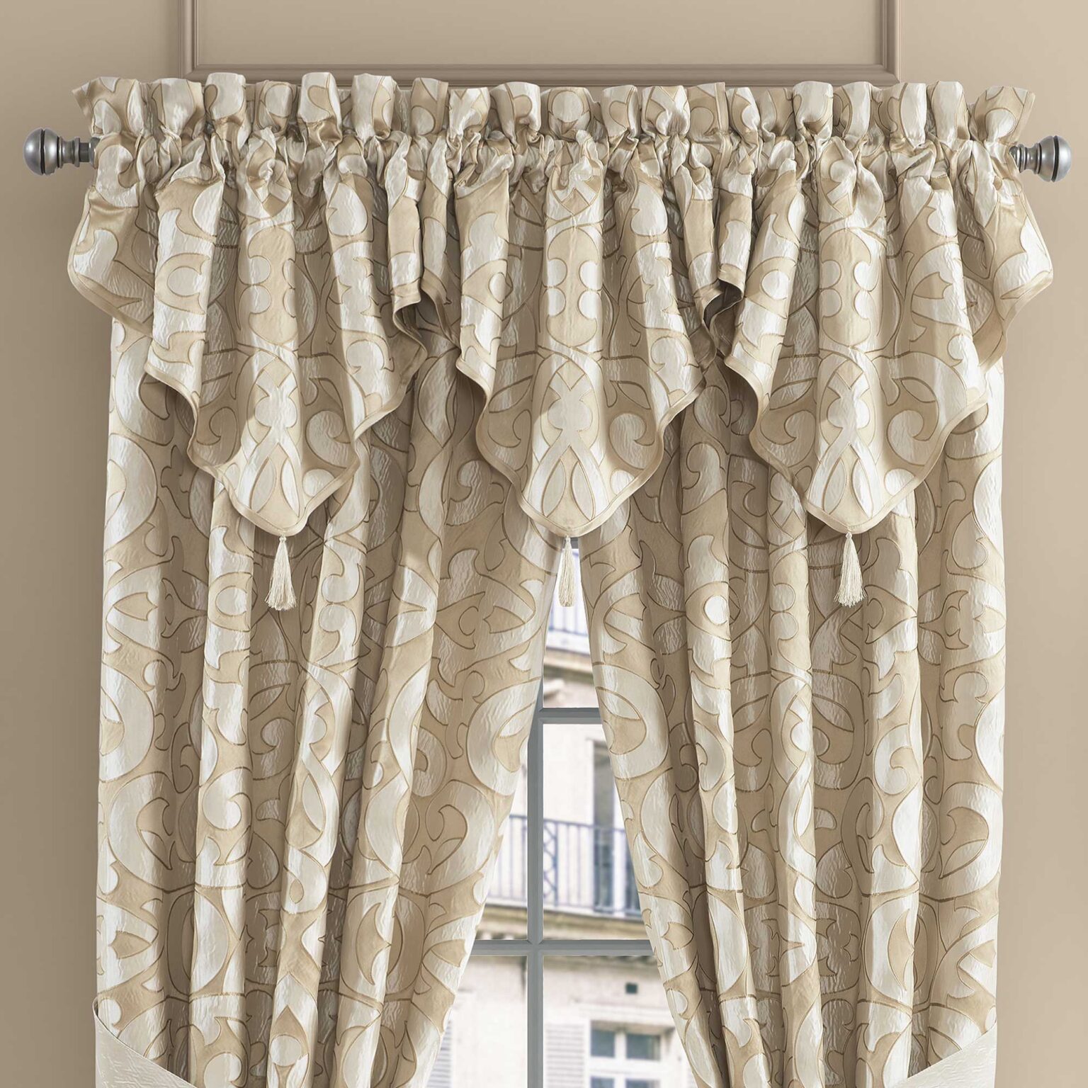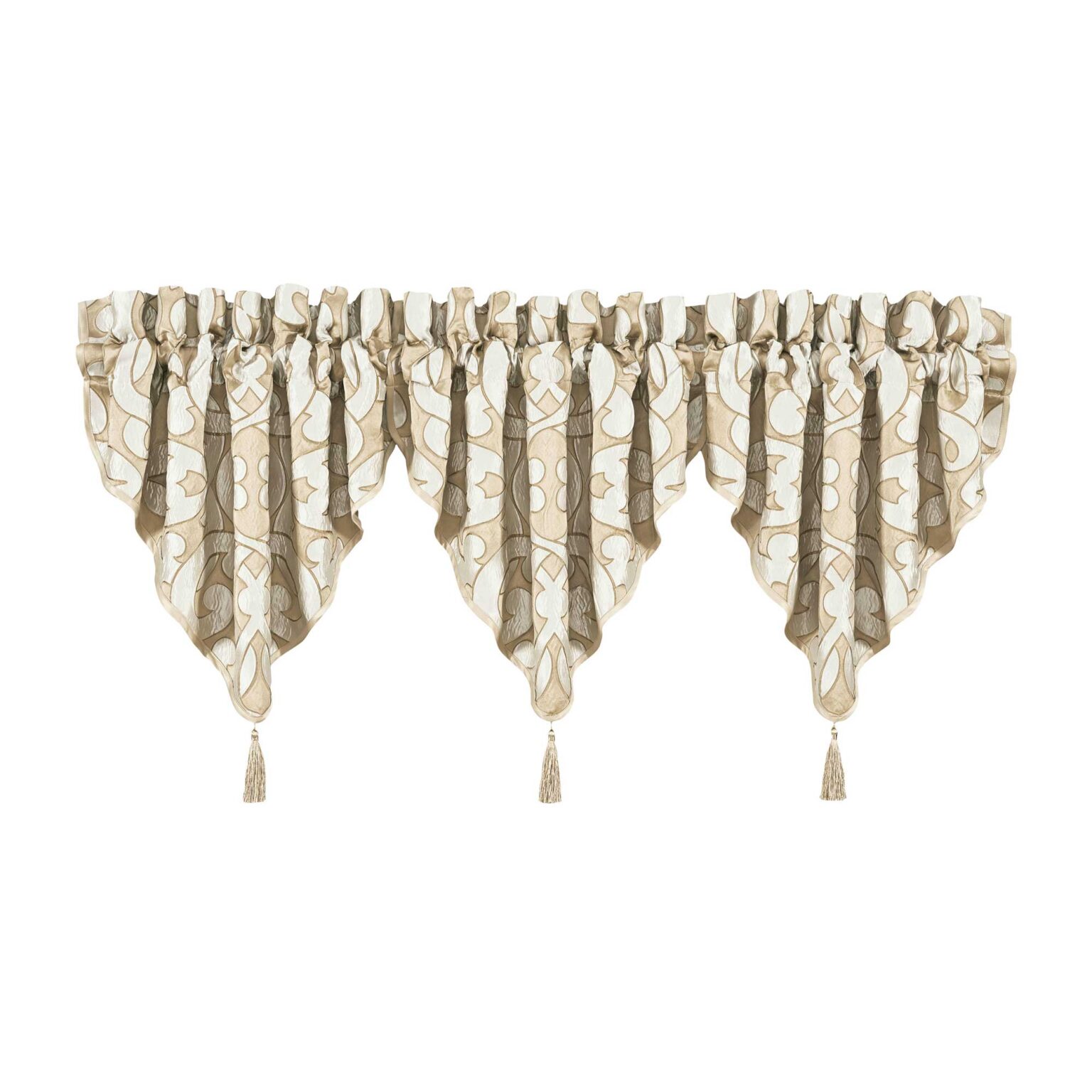 The La Boheme Ascot Valance Is Exquisite With Its Interlocking Woven Damask Design In Ivory And Gold Tones. This Beautiful Valance Is Embellished With A 4” Mingled Tassel, To Add An Elegant Touch To This Grand Design. The 3″ Header And 3″ Rod Pocket Make This Valance Easy To Hang. Window Shown With Three Valances (Each Sold Separately).