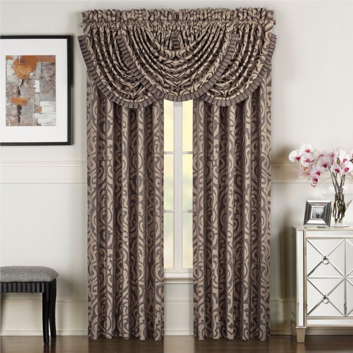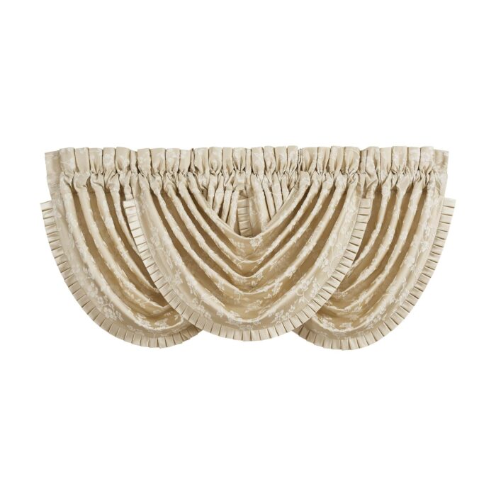 The waterfall valances finish any room with an elegant decorator ambience. Overlapped or side by side, the valances give you the option for multiple decorating options. The valances have 3” rod pockets and 3” headers. The grand scale damask is used as the fabric and is finished with a pleated solid satin.