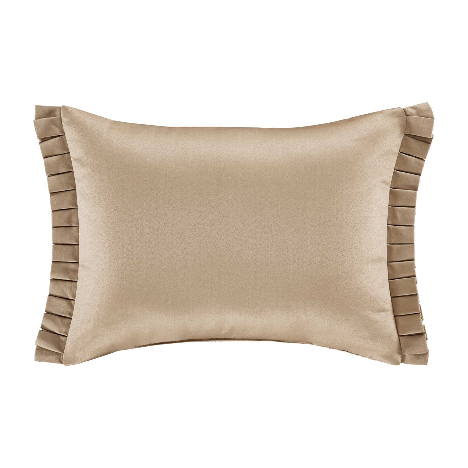 The Lugano Boudoir Pillow Combines All The Elegant Elements Of The Ensemble. The Face Of The Pillow Showcases The “Vermicelli” Texture, Tailored With The French Scroll Border And Finished With Small Buttons. The Two Ends Of The Rectangular Pillow Are Pleated Satin Flanges. The Pillow Reverses To The Coordinating Solid Stain In Stunning Sand Color Tones.