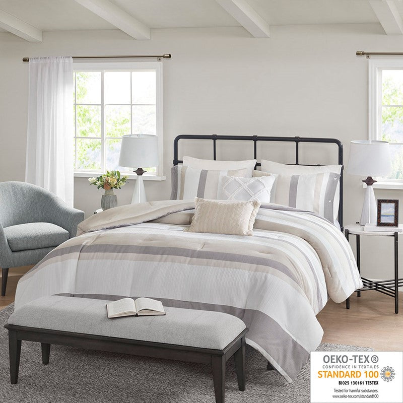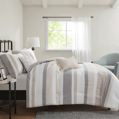 Refresh your bedroom with the casual charm of Madison Park’s Allegany 5 Piece Jacquard Comforter Set. The jacquard comforter features a striped design, in natural, cream, and taupe hues with solid tan reverse, for an updated casual look. The matching shams pair handsomely with the farmhouse-inspired comforter, while an oblong and a square decorative pillow add textural elements to the comforter set. Hypoallergenic polyester filling in the comforter and pillows provides exceptional warmth and comfort all through the night. Machine washable for easy care, this jacquard comforter set has an antimicrobial treatment that provides built-in freshness protection, inhibits growth of odor causing bacteria, and keeps the fabric newer, longer. Bedding may come in rolled or compressed packing and will need to be fluffed up. Use a steam iron to help remove wrinkles easier.