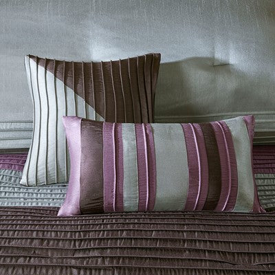 Amherst in Plum is perfect to add a splash of color to your bedroom. The violet and plum colors are paired back with a silver grey color that add a pop color to your room. The filled piping details that run horizontally across the comforter and vertically on the shams, add texture and dimension this this very simple and clean comforter. The reverse is magenta purple color.