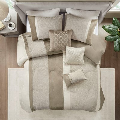 Elevate your bedroom decor with elegance of the Madison Park Atley 7 Piece Comforter Set. The taupe and brown textured velvet comforter and 2 shams feature a pieced design with mink and charmuse details to create a luxurious transitional look. The unique vertical pieced color blocking pattern adds a modern flair to the comforter set. A solid taupe bed skirt and 3 decorative pillows provide the finishing touches to this luxurious comforter set. Hypoallergenic polyester filling in the comforter and pillows provdes exceptional warmth and comfort. Machine washable for easy care, this pieced comforter set brings a sophisticated charm to your bedroom.