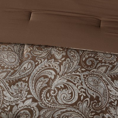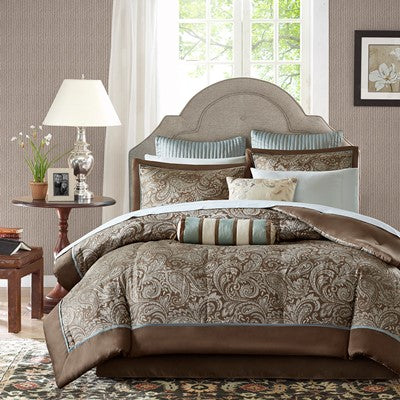 If classic is your style, the Madison Park Aubrey 12 Piece Complete Bed Set is perfect for you. The jacquard weave is inspired from an updated paisley motif and is woven into a beautiful combination of soft blue, taupe and a hint of platinum for a touch of sheen to your bedding. The comforter and shams offer beautiful details with a 2″ flange and 1/2″ flat piping in soft blue. The reverse of the comforter is a soft brown color. The set comes with a sheet set that is 100% cotton, 200 thread count, and the soft blue coordinates back perfectly to the bedding collection. Items in the set may come in a rolled or compressed packaging, which will need to be fluffed up or steam ironed before use to remove wrinkles.
