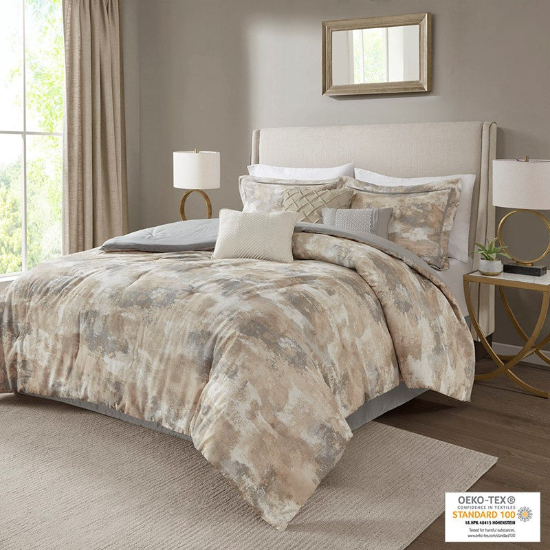 Modernize your bedroom decor with the chic styling of the Madison Park Beacon 7 Piece Comforter Set. This luxurious comforter features an abstract print in various gray, taupe and cream color on the cotton-rich ottoman weave face with a solid grey reverse to create a glamorous look. The 2 matching shams mirror the abstract design of the comforter, while 3 coordinating decorative pillows with embroidered details add the finishing touches. A complementary solid grey bed skirt provides a clean finish to complete this modern comforter set. This bedding set is also OEKO-TEX certified, meaning it does not contain any harmful substances or chemicals to ensure quality comfort and wellness. Items in the set may come in a rolled or compressed packaging, which will need to be fluffed up or steam ironed before use to remove wrinkles.