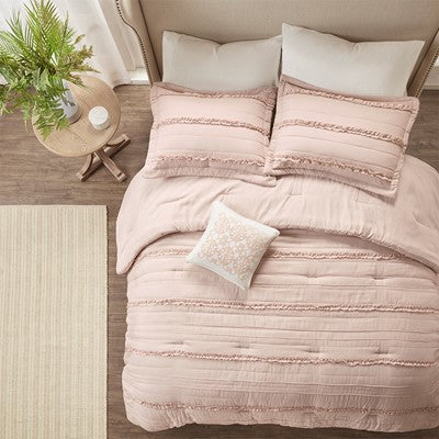 Create a shabby chic look in your bedroom with the Madison Park Celeste Collection. This solid pink comforter has ruffles and quilting paired with a contrasting embroidered decorative pillow for a clean update for your space.
