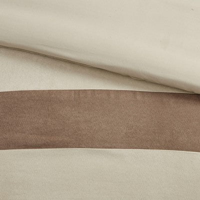 The Madison Park Dax 7 Piece Microsuede Comforter Set brings a rich and elegant update to your bedroom. This tan microsuede comforter and 2 matching shams feature a unique pieced color blocking design to create a luxurious modern allure. A solid bed skirt coordinates handsomely with the comforter, while 3 decorative pillows provide textural finishing touches to the hotel style comforter set. Machine washable for easy care, this transitional style comforter has an antimicrobial odor protection treatment that provides built-in freshness protection, inhibits growth of odor causing bacteria, and keeps the fabric newer, longer. Items in the set may come in a rolled or compressed packaging, which will need to be fluffed up or steam ironed before use to remove wrinkles.