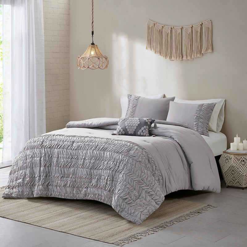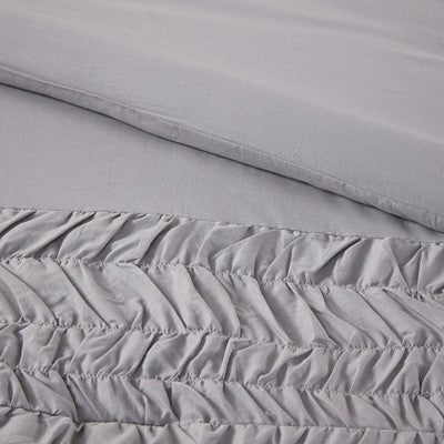 Turn your bedroom into a cozy and clean space with the Madison Park Doreen 4 Piece Cotton Comforter Set. This cotton comforter features a solid gray section with a ruched design at the foot end that adds dimension to the shabby chic look. The 2 matching shams also flaunt a ruched pattern to coordinate with the farmhouse comforter. An oblong decorative pillow with embroidered details adds the finishing touch to the shabby chic bedding set. Machine washable for easy care, this cotton comforter set brings a comfortable and charming update to your bedroom.