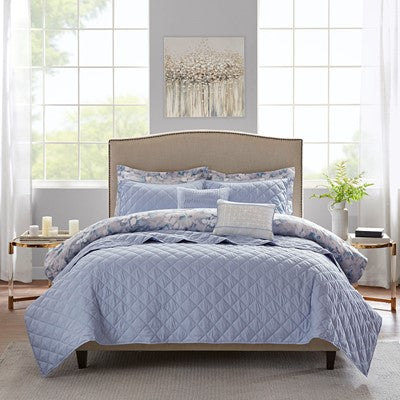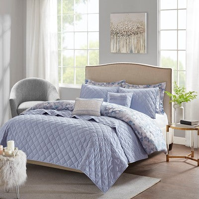The Madison Park Erica 8 Piece Printed Seersucker Comforter and Coverlet Set Collection offers a fresh transitional update to your bedroom decor. The textured seersucker comforter features a floral print in blue and grey hues with a solid grey reverse that creates a charming look. A solid blue quilted coverlet complements the comforter and is perfect for use in for all season. Two shams with a floral print coordinate back to the comforter, while two solid quilted shams pair perfectly with the coverlet. Completing the bedding collection are two decorative pillows with embroidered and pleated details, for the perfect finishing touches. Hypoallergenic filling in the comforter, coverlet, and decorative pillows provides exceptional warmth and comfort. Machine washable for easy care, this seersucker comforter and coverlet set collection transforms your bedroom into a cozy getaway.