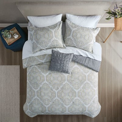 Complete reversible bed set with comforter and sheet set featuring yellow, grey, taupe medallion print