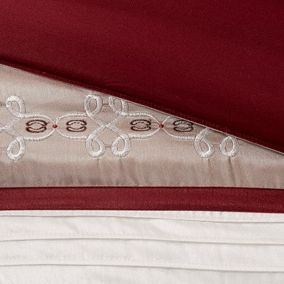Update your entire space instantly with the Madison Park Essentials Jelena 24 Piece Room in a Bag. The bold red base on this comforter works beautifully with the soft white and red piecing. Decorative embroidery adorns the bottom portion of this comforter and the center of each sham creating a rich look in your space. Four solid red window panels, four taupe tie backs and two embroidered valances accompany your new bedding for a whole room makeover. Four embroidered decorative pillows, two euro shams and a bedskirt put the finishing touches on this complete look. This bedding set may come in rolled or compressed packing and will need to be fluffed up. Use a steam iron to help remove wrinkles easier.