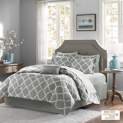 The Madison Park Essentials Merritt Reversible Complete Comforter and Cotton Sheet Set adds a simple yet chic look to your space. The comforter features a fretwork design against a vivid base that flips the color scheme on the reverse, for two distinct modern looks. Matching shams (1 in Twin Sizes) mirror the design on the face of the comforter, while an embroidered decorative pillow and solid bedskirt complete the bedding set. The included 100% cotton printed sheet set features a smaller scale fretwork pattern that complements the comforter. Bringing the best in health and wellness, this bedding set also features an anti-microbial treatment that provides built-in freshness protection, reducing the growth of odor causing bacteria and keeps fabric lasting longer. This bedding set is also OEKO-TEX certified, meaning it does not contain any harmful substances or chemicals, ensuring quality comfort and wellness. This bedding set may come in rolled or compressed packing and will need to be fluffed up. Use a steam iron to help remove wrinkles easier.
