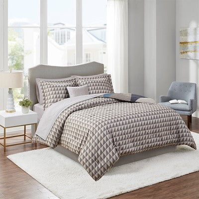 Brighten your bedroom with the stunning modern style of the Madison Park Essentials Remy 8 Piece Reversible Complete Bed Set (includes sheets). The reversible comforter features a large multi-color triangle pattern that flips to a smaller grey triangle print on the reverse, for a brilliant contemporary look. Two matching reversible shams (1 in Twin Sizes) pair perfectly with the comforter, while a grey decorative pillow adds the finishing touch. Also included is a matching print sheet set with 2 pillowcases (1 for Twin Sizes), a flat sheet, and a fitted sheet that fits up to a 14″ mattress depth. Machine washable for easy care, this reversible complete bed set transforms your bedroom into a gorgeous modern space. Bringing the best in health and wellness, this bedding set also features an anti-microbial treatment that provides built-in freshness protection, reducing the growth of odor causing bacteria and keeps fabric lasting longer. This bedding set is also OEKO-TEX certified, meaning it does not contain any harmful substances or chemicals, ensuring quality comfort and wellness.