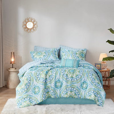 The Madison Park Essentials Serenity Complete Comforter and Cotton Sheet Set provides a fresh globally inspired look for your bedroom. An intricate medallion pattern repeats across the top of bed in brilliant shades of complementary colors to play up the oversized print. An oblong pillow uses decorative embroidery and piecing to create texture on the top of bed. Also included is a complete cotton sheet set that features a coordinating medallion print to complete the look. Bringing the best in health and wellness, this bedding set also features an anti-microbial treatment that provides built-in freshness protection, reducing the growth of odor causing bacteria and keeps fabric lasting longer. This bedding set is also OEKO-TEX certified, meaning it does not contain any harmful substances or chemicals, ensuring quality comfort and wellness. This bedding set may come in rolled or compressed packing and will need to be fluffed up. Use a steam iron to help remove wrinkles easier.