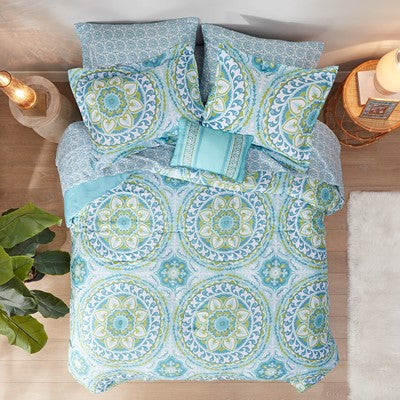 The Madison Park Essentials Serenity Complete Comforter and Cotton Sheet Set provides a fresh globally inspired look for your bedroom. An intricate medallion pattern repeats across the top of bed in brilliant shades of complementary colors to play up the oversized print. An oblong pillow uses decorative embroidery and piecing to create texture on the top of bed. Also included is a complete cotton sheet set that features a coordinating medallion print to complete the look. Bringing the best in health and wellness, this bedding set also features an anti-microbial treatment that provides built-in freshness protection, reducing the growth of odor causing bacteria and keeps fabric lasting longer. This bedding set is also OEKO-TEX certified, meaning it does not contain any harmful substances or chemicals, ensuring quality comfort and wellness. This bedding set may come in rolled or compressed packing and will need to be fluffed up. Use a steam iron to help remove wrinkles easier.