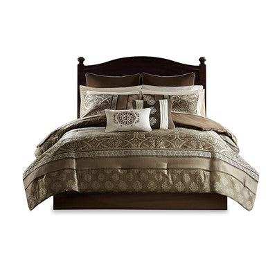 The Madison Park Essentials Zara 16 Piece Jacquard Complete Bedding Set with 2 Sheet Sets offers a luxurious traditional update for your bedroom. An elegant jacquard design, in shades of brown, adorns the face on the comforter and a solid dark brown reverse complements the top of the bed. Two shams and two dark brown Euro shams perfectly complement the comforter, while three decorative pillows with embroidery and pintuck details and a solid brown bedskirt provide the finishing touches. Also included are two complete sheet sets with fitted sheets that fit up to 16-inch mattress depth. One sheet set showcases a medallion print and the other is a solid brown that coordinate back to the jacquard bedding set. Bringing the best in health and wellness, this bedding set also features an anti-microbial treatment that provides built-in freshness protection, reducing the growth of odor causing bacteria and keeps fabric lasting longer. Filled with hypoallergenic filling in the comforter and decorative pillows, this jacquard complete bedding set transforms your entire bedroom with its traditional style and is machine washable for easy care. This bedding set may come in rolled or compressed packing and will need to be fluffed up. Use a steam iron to help remove wrinkles easier.