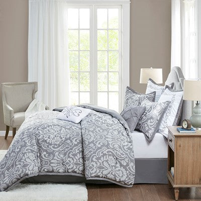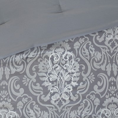 Give your bedroom a touch of elegance with the Madison Park Flourish 8 Piece Jacquard Comforter Set. The jacquard comforter features an all-over embroidered damask pattern with a solid grey microfiber reverse, for a stunning traditional look. The 2 shams also flaunt elegant embroidery to match the comforter, while the 2 Euro shams add a complementary touch. A solid grey bed skirt and 2 decorative pillows provide the finishing touches to this jacquard comforter set. Items in the set may come in a rolled or compressed packaging, which will need to be fluffed up or steam ironed before use to remove wrinkles.