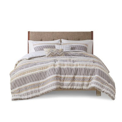 Give your bedroom a cozy farmhouse charm with the Madison Park Newton 5 Piece Cotton Printed Comforter Set. This cotton comforter features a printed waffle design and various geometric patterns with chenille trim details, for a farmhouse look. The 2 matching shams pair perfectly with similar yellow and charcoal prints, while 2 decorative pillows with embroidered details add the finishing touches to this casual comforter set. Machine washable for easy care, this cotton printed comforter set offers a modern take on a charming farmhouse style to update your bedroom.