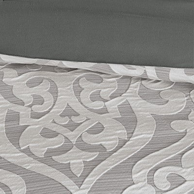 Add a touch of class to your bedroom with the Madison Park Odette 8 Piece Jacquard Comforter Set. The luxurious textured jacquard comforter and shams flaunt a gorgeous damask medallion design with silver striations on the satin ground that add dimension to the lavish look. A solid grey reverse and stunning Euro shams complement the top of the bed to complete the ensemble. Also included are two decorative pillows that feature embroidery and cording details, while a solid silver bed skirt provides a clean and elegant finish. Overfilled for superior warmth and comfort, this jacquard comforter set offers a strikingly luxurious update to your decor. Items in the set may come in a rolled or compressed packaging, which will need to be fluffed up or steam ironed before use to remove wrinkles.