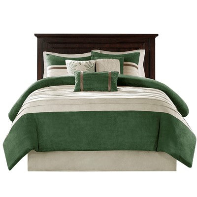 The Madison Park Palmer 7 Piece Comforter Set offers a classic and refined update to your bedroom decor. This transitional style comforter features a pieced microsuede design in rich contrasting green and beige colors to create an incredibly soft look and feel. The 2 matching shams also flaunt a pieced construction to coordinate with the faux suede comforter. A solid beige bed skirt and 3 decorative pillows with a mix of embroidered designs add the perfect finishing touches to complete this lush traditionally-inspired comforter. Machine washable for easy care, items in the set may come in a rolled or compressed packaging, which will need to be fluffed up or steam ironed before use to remove wrinkles.