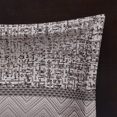 Give your bedroom a new luxurious look with the Madison Park Rhapsody 7 Piece Jacquard Comforter Set. This jacquard comforter features a grey and taupe stripe design of several different motifs on the face with a solid grey reverse, for a chic transitional look. The 2 matching shams complement the design of the comforter to complete this glam comforter set. Also included is a solid brown bed skirt and 3 decorative pillows with embroidery and pleated details provide the finishing touches. Machine washable for easy care, this jacquard comforter set brings a sophisticated update to your bedroom decor. Items in the set may come in a rolled or compressed packaging, which will need to be fluffed up or steam ironed before use to remove wrinkles.