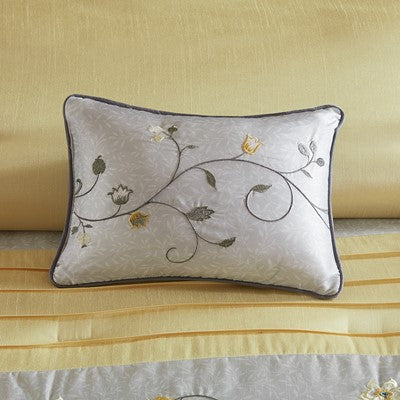 Elegantly update your bedroom with the Madison Park Serene 7 Piece Comforter Set. A beautifully embroidered floral pattern is showcased on the faux silk comforter. The pieced design, in yellow and grey hues, adds a lovely contrast and texture to the ensemble. The solid dark grey reverse complements the enticing design seen on the top of the comforter and continues gracefully down to the bed skirt. Matching shams bring the unique style of the comforter to the head of the bed, giving it a truly luxurious look. Three decorative pillows with intricate embroidery, pleating, and piecing, complete this exquisite comforter set. Items in the set may come in a rolled or compressed packaging, which will need to be fluffed up or steam ironed before use to remove wrinkles.