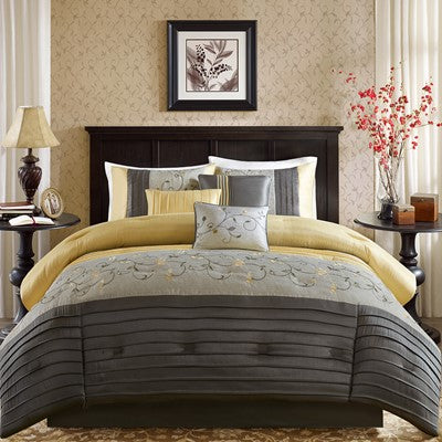 Elegantly update your bedroom with the Madison Park Serene 7 Piece Comforter Set. A beautifully embroidered floral pattern is showcased on the faux silk comforter. The pieced design, in yellow and grey hues, adds a lovely contrast and texture to the ensemble. The solid dark grey reverse complements the enticing design seen on the top of the comforter and continues gracefully down to the bed skirt. Matching shams bring the unique style of the comforter to the head of the bed, giving it a truly luxurious look. Three decorative pillows with intricate embroidery, pleating, and piecing, complete this exquisite comforter set. Items in the set may come in a rolled or compressed packaging, which will need to be fluffed up or steam ironed before use to remove wrinkles.