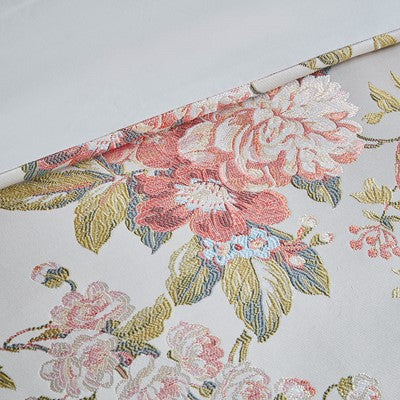 18×18″ pillow: 100% polyester floral jacquard on the face, cut by pattern; polyester diamond jacquard back; small cording around four sides
