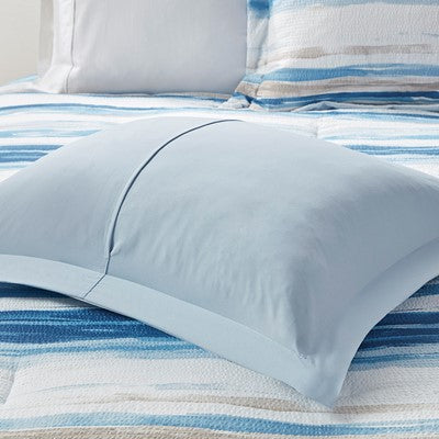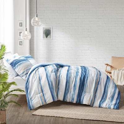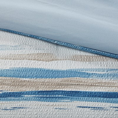 Create a relaxing and tranquil atmosphere in your bedroom with Madison Park Kate 3 Piece Printed Seersucker Comforter Set. The textured seersucker comforter features a watercolor stripe print in blue and white hues and a light blue reverse, for a serene look. Two shams mirror the design on the face of the comforter . Hypoallergenic polyester filling in the comforter for exceptional warmth and comfort. Machine washable for easy care, this seersucker comforter provides a complete transformation for your bedroom decor.