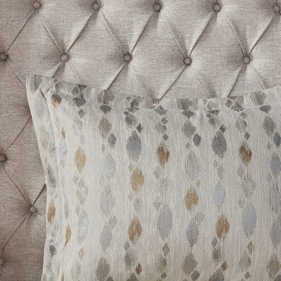 The Madison Park Signature Sanctuary King 9 Piece Comforter set offers a luxurious update to your bedroom decor. The oversized and overfilled jacquard comforter features all-over symmetric diamond shapes, in ivory, taupe, gold and silver, with slubbed yarns that create a rich texture and modern look. A heavyweight comforter insert is secured inside the comforter with 4 inner ties and a button closure and is removable for easy care. Two matching shams pair beautifully with the comforter, while coordinating euro shams complete the top of the bed. Also included are 2 square decorative pillows and 1 oblong decorative pillow with embroidered details that provide the finishing touches to this jacquard comforter set. Hypoallergenic polyester filling in the comforter insert and the decorative pillows offers exceptional warmth and comfort. Add beauty and grace to your bedroom by incorporating this jacquard comforter set into your decor. Dry clean comforter cover only and machine wash comforter filler.