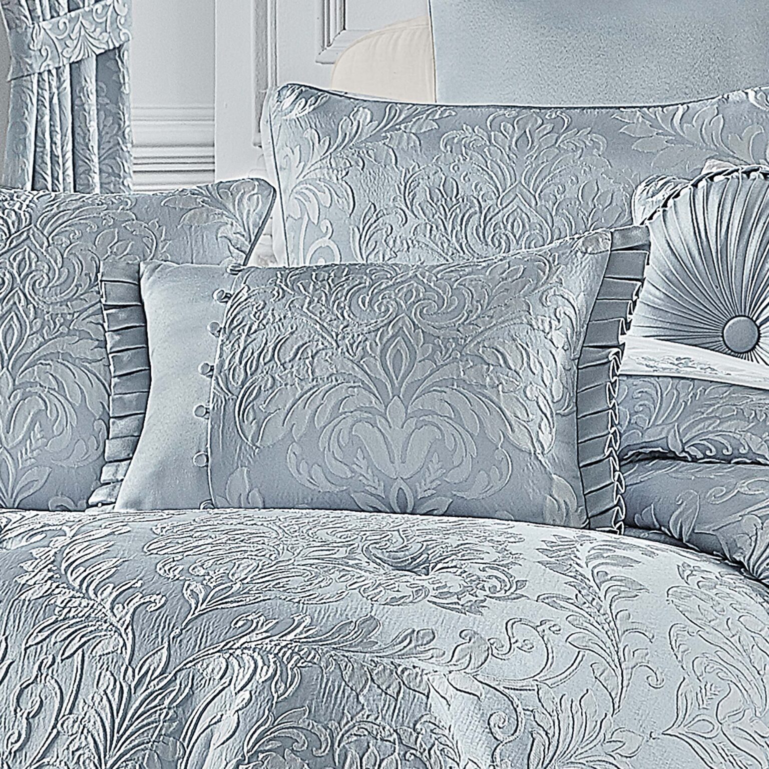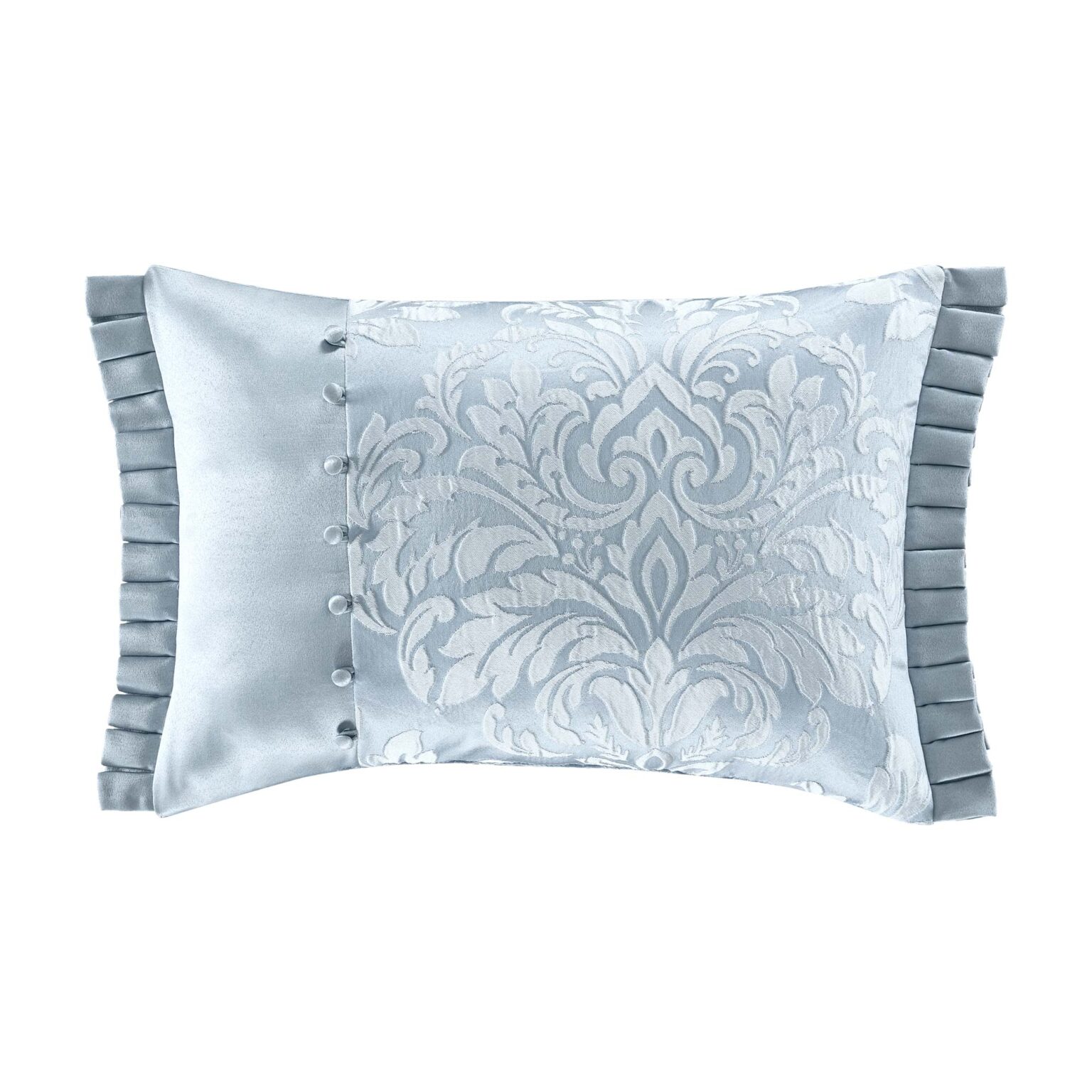 The Malita Boudoir Throw Pillow Showcases a Tailored French Scroll Border on a Powder Blue Satin Fabric and is Finished With Small Button Accents. The Two Ends of the Rectangular Pillow are Pleated With Satin Flanges for Added Detail. The Pillow Reverses to a Coordinating Solid Satin Fabric. The Malita Comforter Set and Window Treatments are Available Separately.