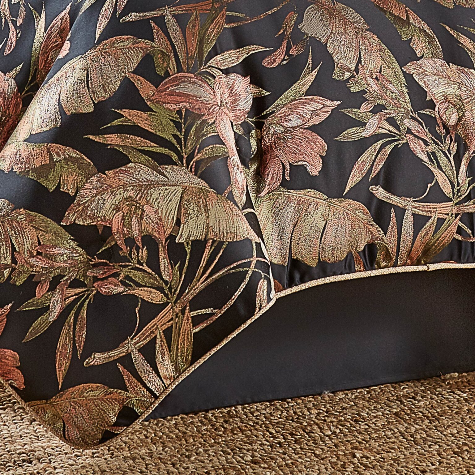 The Martinique 4 Piece Comforter Set Bedding Collection Is Exquisite With Its Fine Details And Bold Use Of Black And Coral Tones. This Beautifully Printed Tropical Pattern Featuring Palm Leaves And Flowers Is Sophisticated With A Dry Fabric Finish To Give It Casual Coastal Appeal. Paired With Matching Hidden Zipper Pillow Shams And A Solid Black Split Corner Bedskirt, This Oversized Ensemble Will Make You Feel Like A You’Re On A Relaxed Beach Front Vacation. The Reverse Of This Set Is A Microfiber Dyed To Match The Black Ground Of The Tropical Print And Finished With A 1/4″ Gold Piping For Added Detail. Pair This Comforter Set With The JQueen NY Martinique Window Treatments, Throw Pillows, And Euro Shams For A Complete Look.