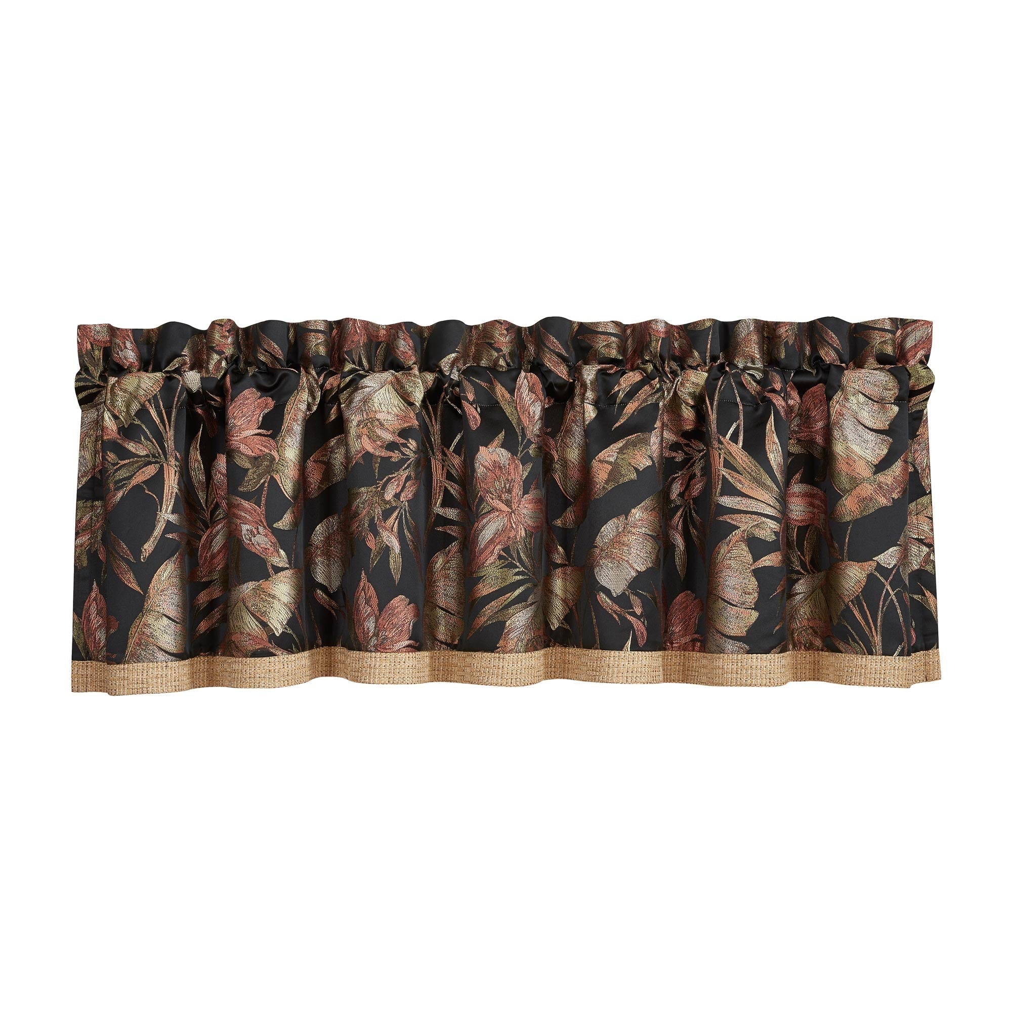 The Martinique Straight Window Valance Is Exquisite With Its Fine Details And Bold Use Of Black And Coral Tones. This Beautiful Printed Tropical Pattern Featuring Palm Leaves And Flowers Is Sophisticated Yet Fun. Finished With A Lovely Textured Gold Tweed Fabric At The Bottom, This Valance Is The Perfect Finishing Touch To This Grand Tropical Design. The 3″ Header And 3″ Rod Pocket Make This Valance Easy To Hang. Pair This Valance With The Martinique Window Panels And Bedding Collection For A Complete Look.