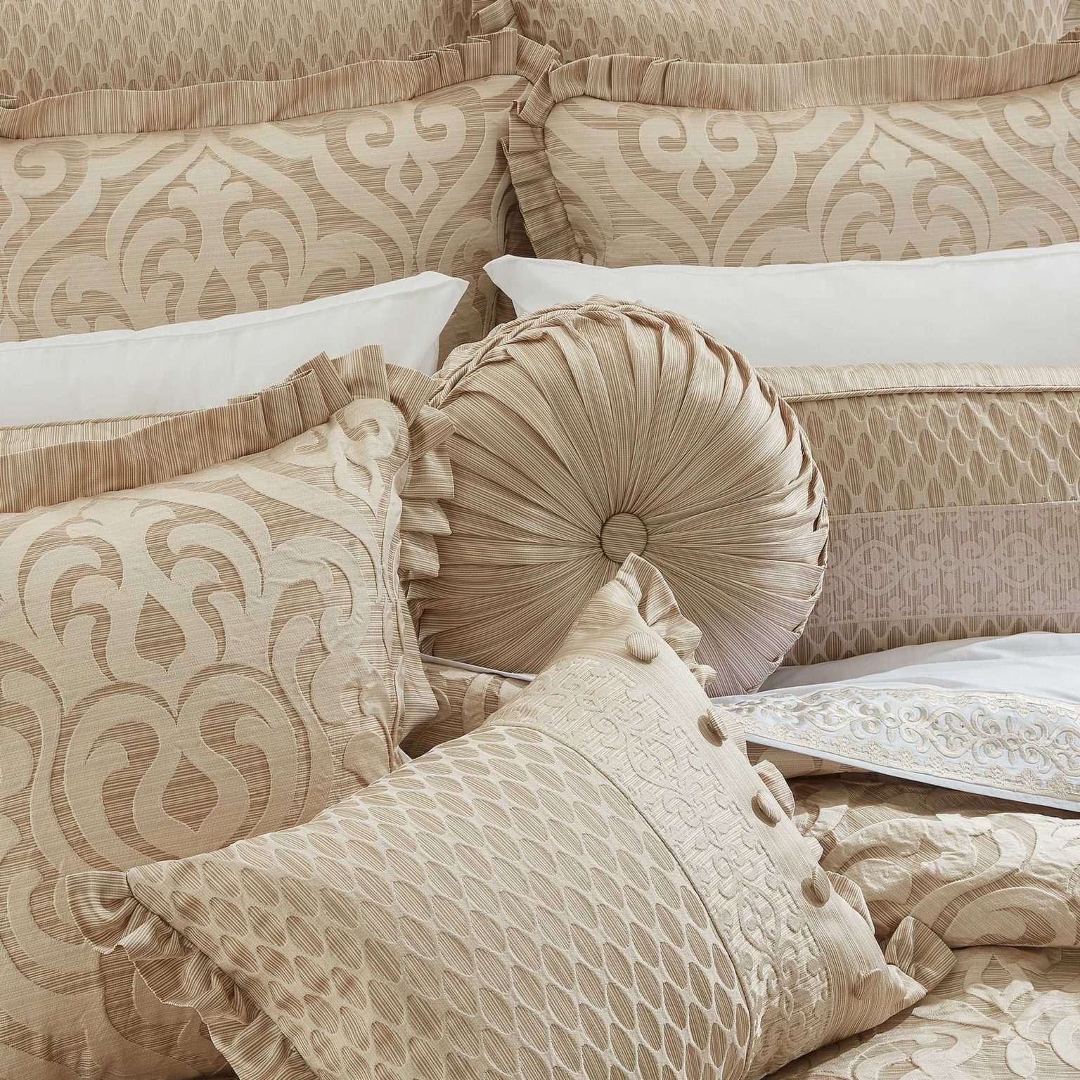 Hand Crafted Luxury, The Montpellier Boudoir Pillow Adds Texture And Elegance To The Ensemble. A Special Pleating Effect Using The Textured Satin Is Combined With The Delicate Coordinating Border And Diamond Fabric To Create A Custom Accent Pillow. Both Ends Of The Boudoir Are Finished With Pleated Satin Flanges And The Reverse Of The Pillow Is A Textured Sand Color Satin. Pair This Pillow With The Montpellier Bedding Set By JQueen NY For An Updated Traditional Look.