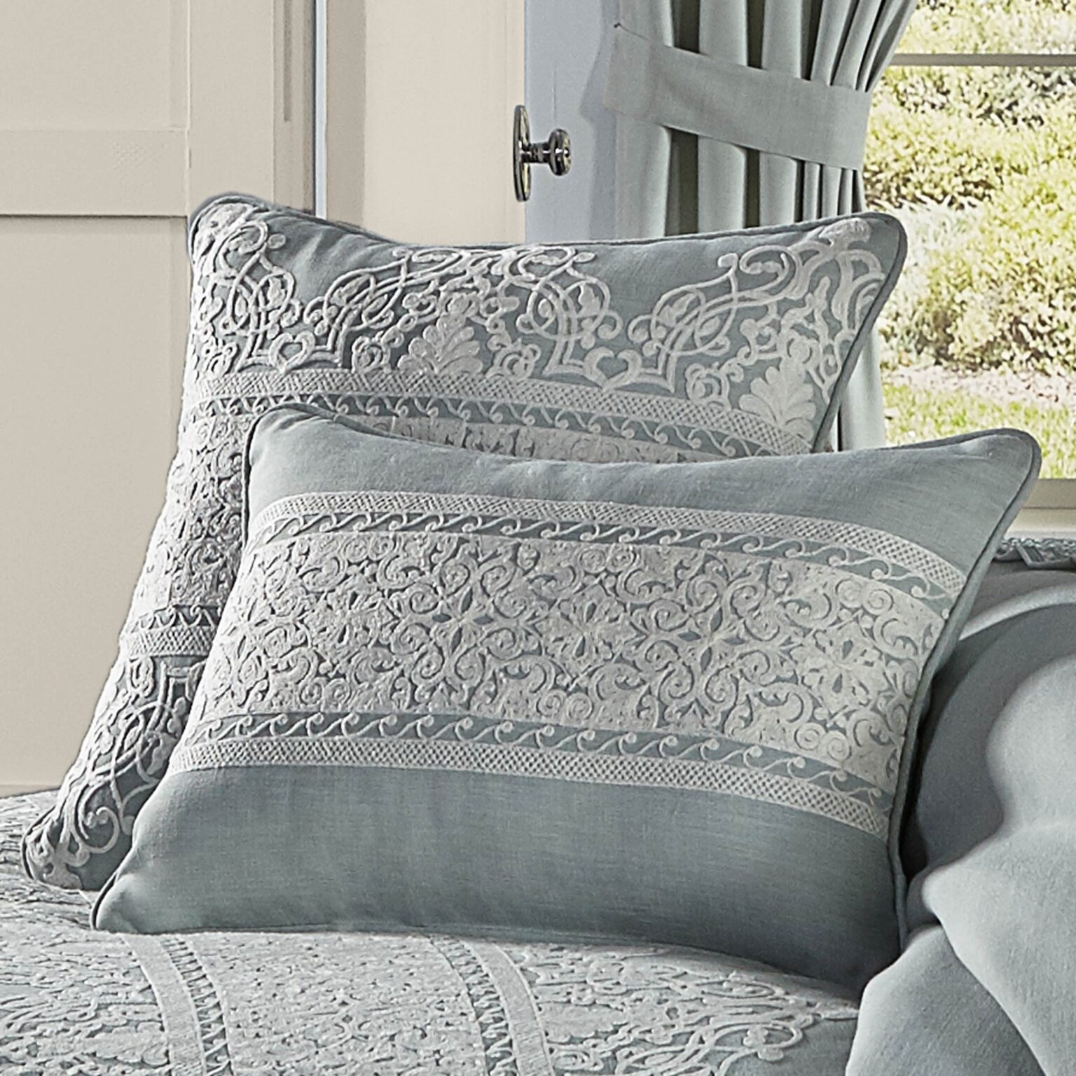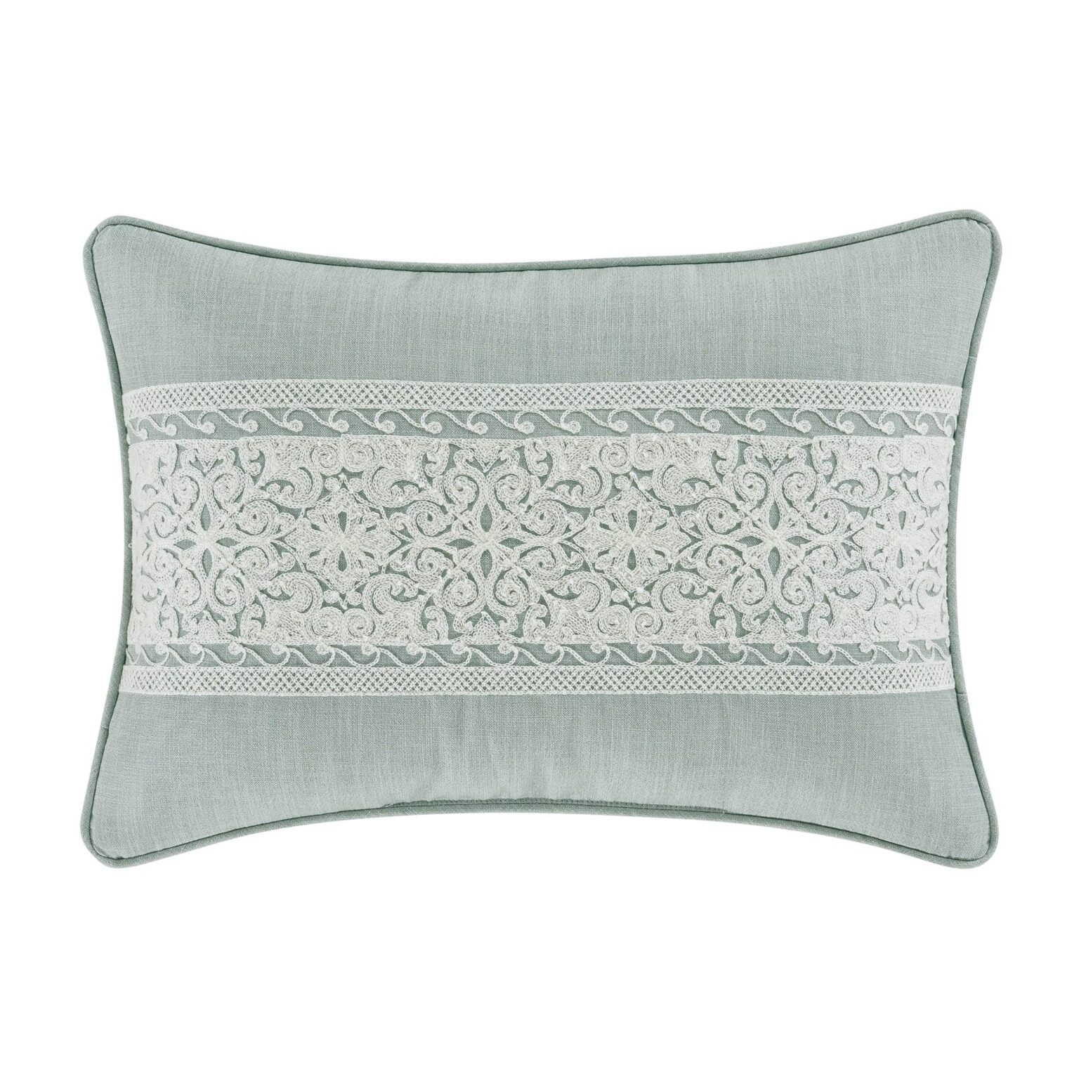 The Patricia Boudoir Throw Pillow Is Exquisite With Its Sophisticated Use Of Spa And Cream Colors. This Beautiful Accent Pillow Is Sophisticated With A Transitional, Ornate Embroidered Design On Top Of A Spa Faux Linen, Finished With A 1/4″ Spa Piping. Pair This Pillow With The Patricia Bedding Set By JQueen NY For A Complete Elegant Look.