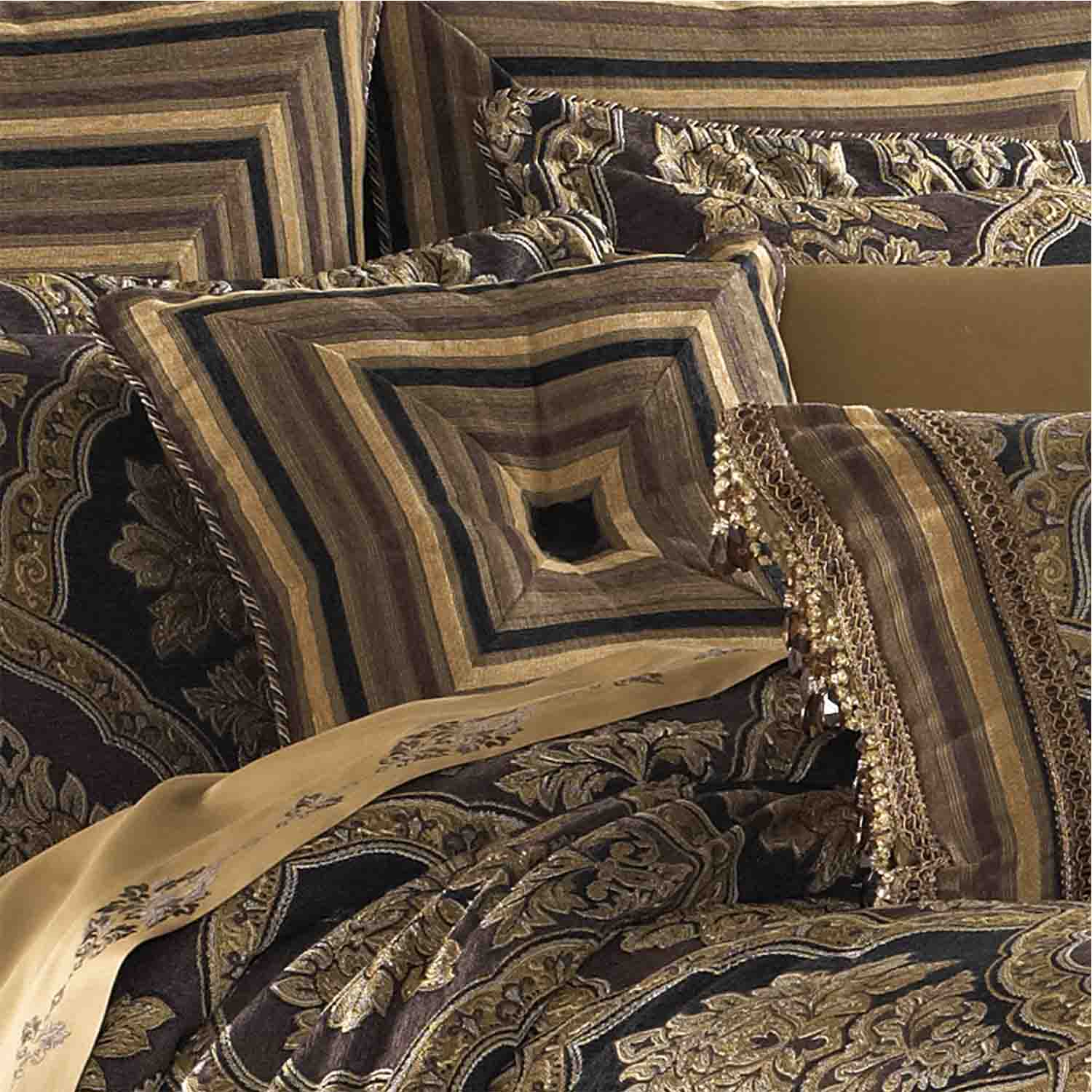 Reilly is a woven chenille damask. This bedding collection consists of shades of gold and black. The oversized comforter is embellished with tricolor twist cord.
