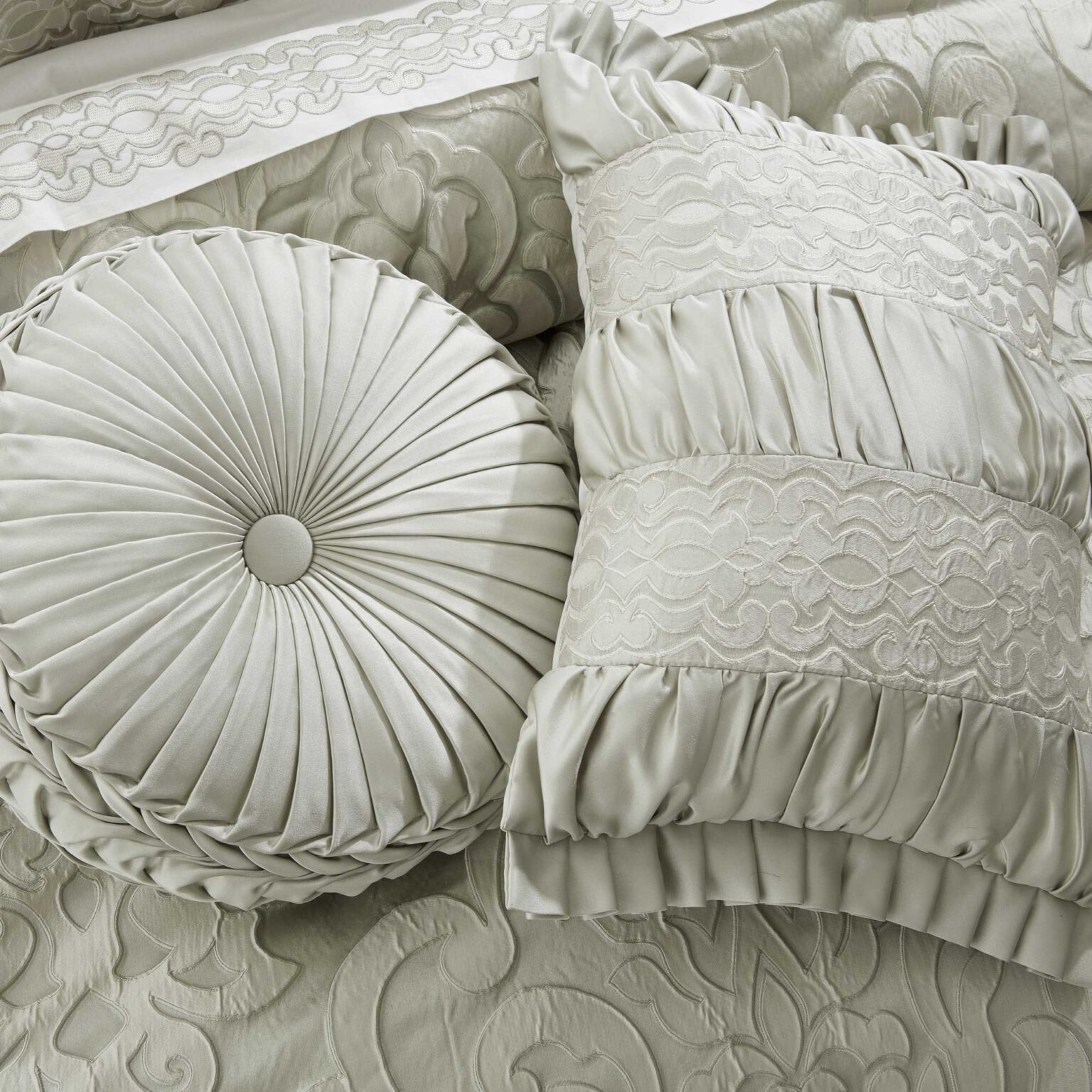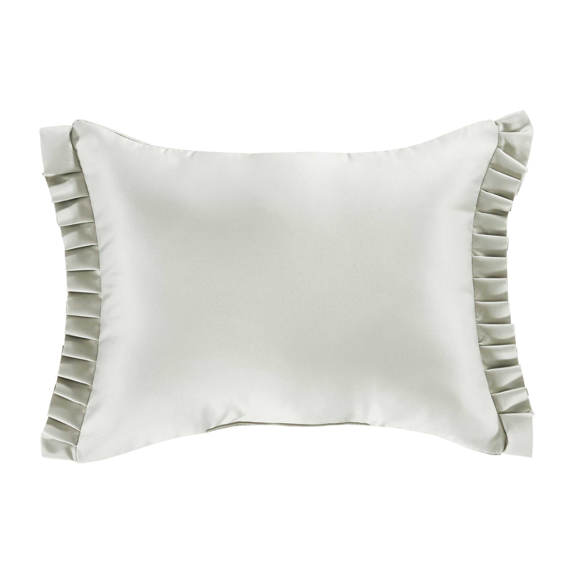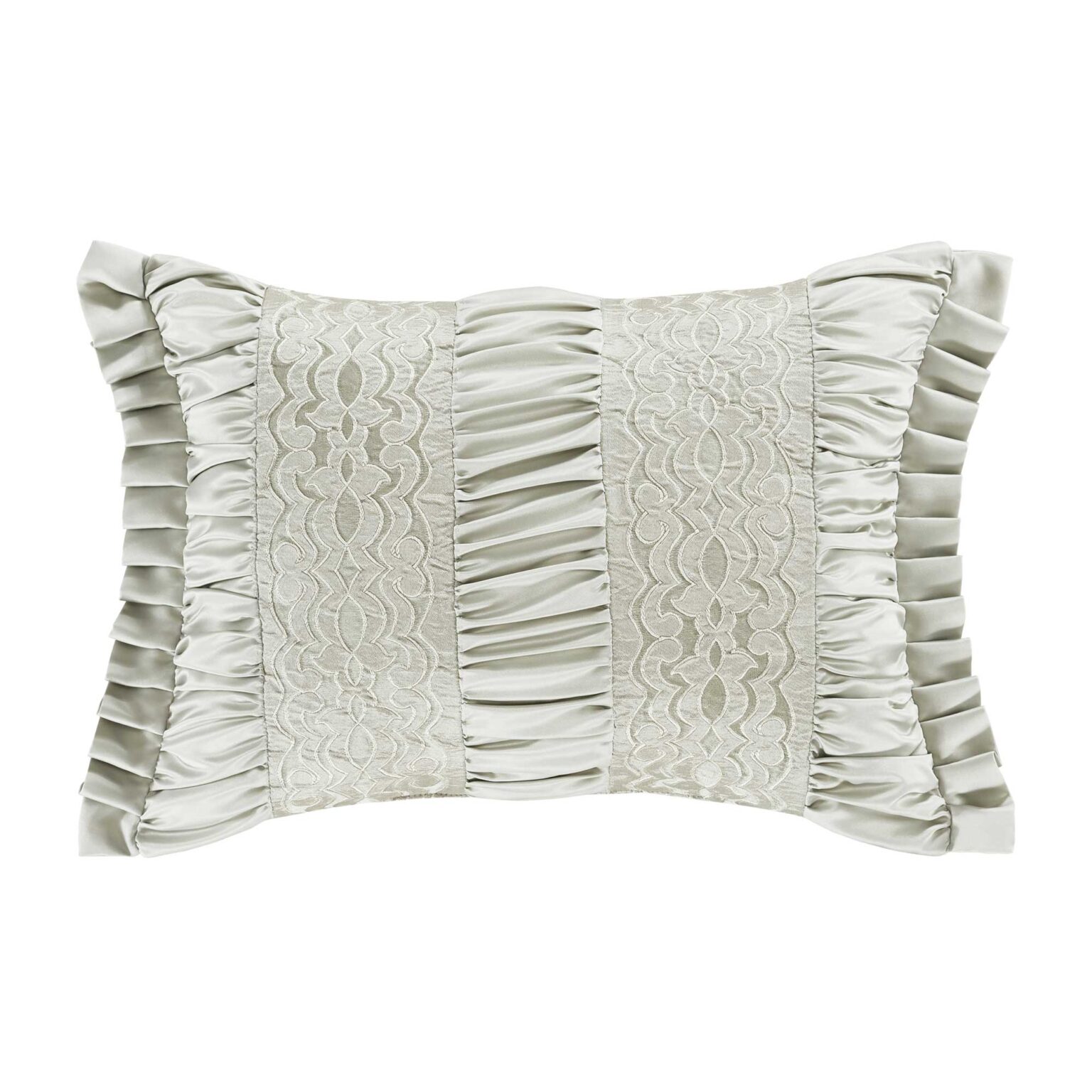 The Surano Boudoir Throw Pillow Adds A Simple Yet Sophisticated Tonal Look To Your Bedding Decor. Combining A Medallion Border Design With Vertical Bands In Soft Celadon Green Hues. Each End Of The Boudoir Pillow Is Trimmed With A Pleated Satin Flange. Pair This Pillow With The Surano Bedding Set By JQueen NY For An Updated Luxe Look.
