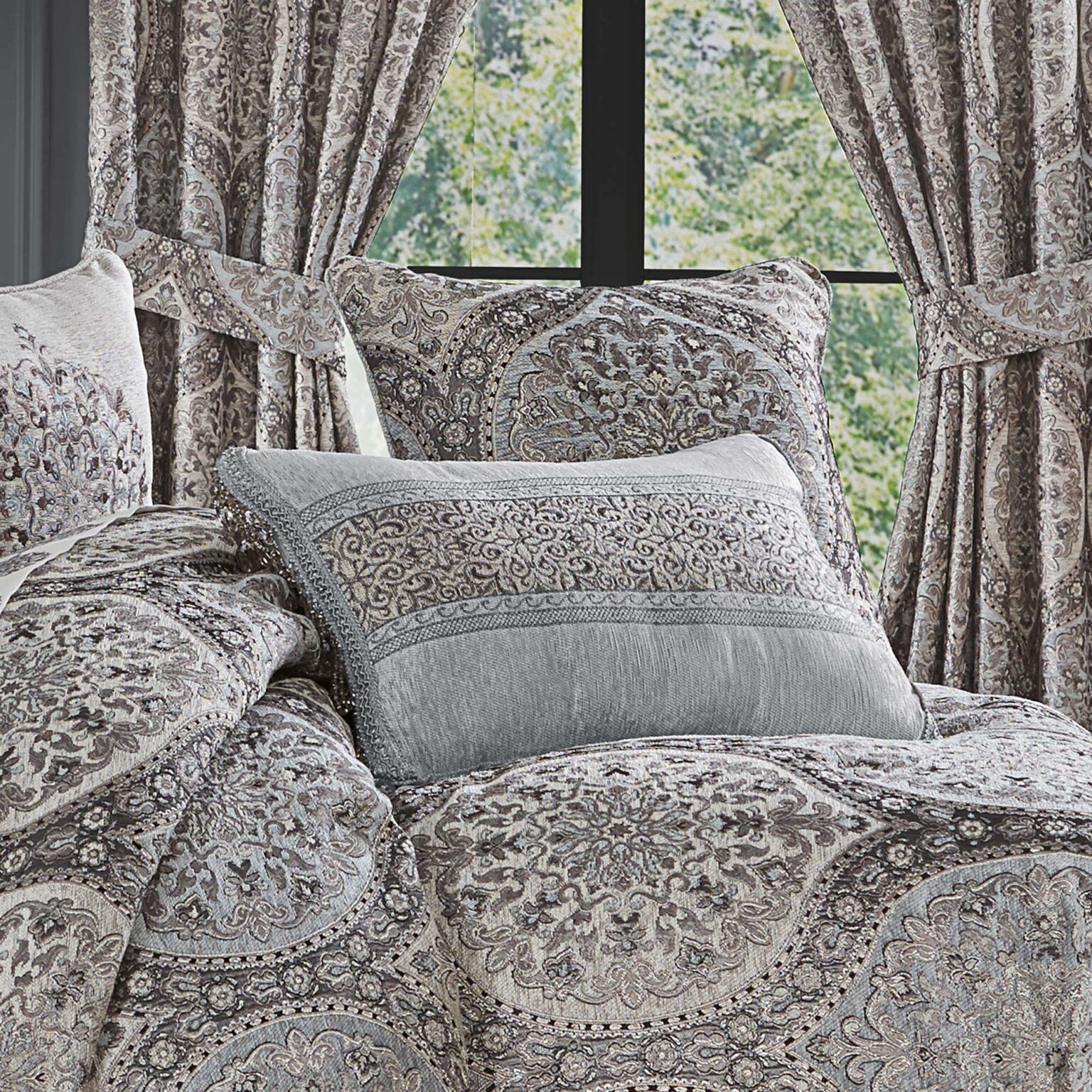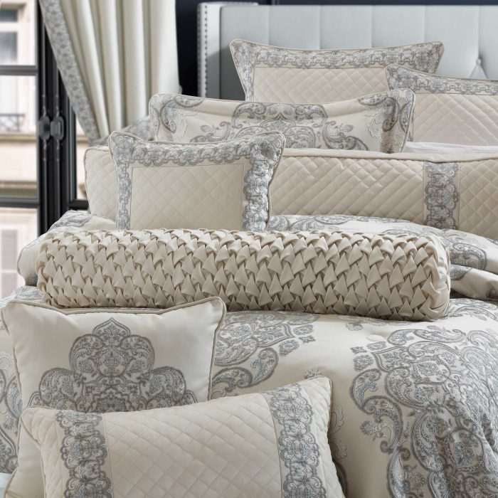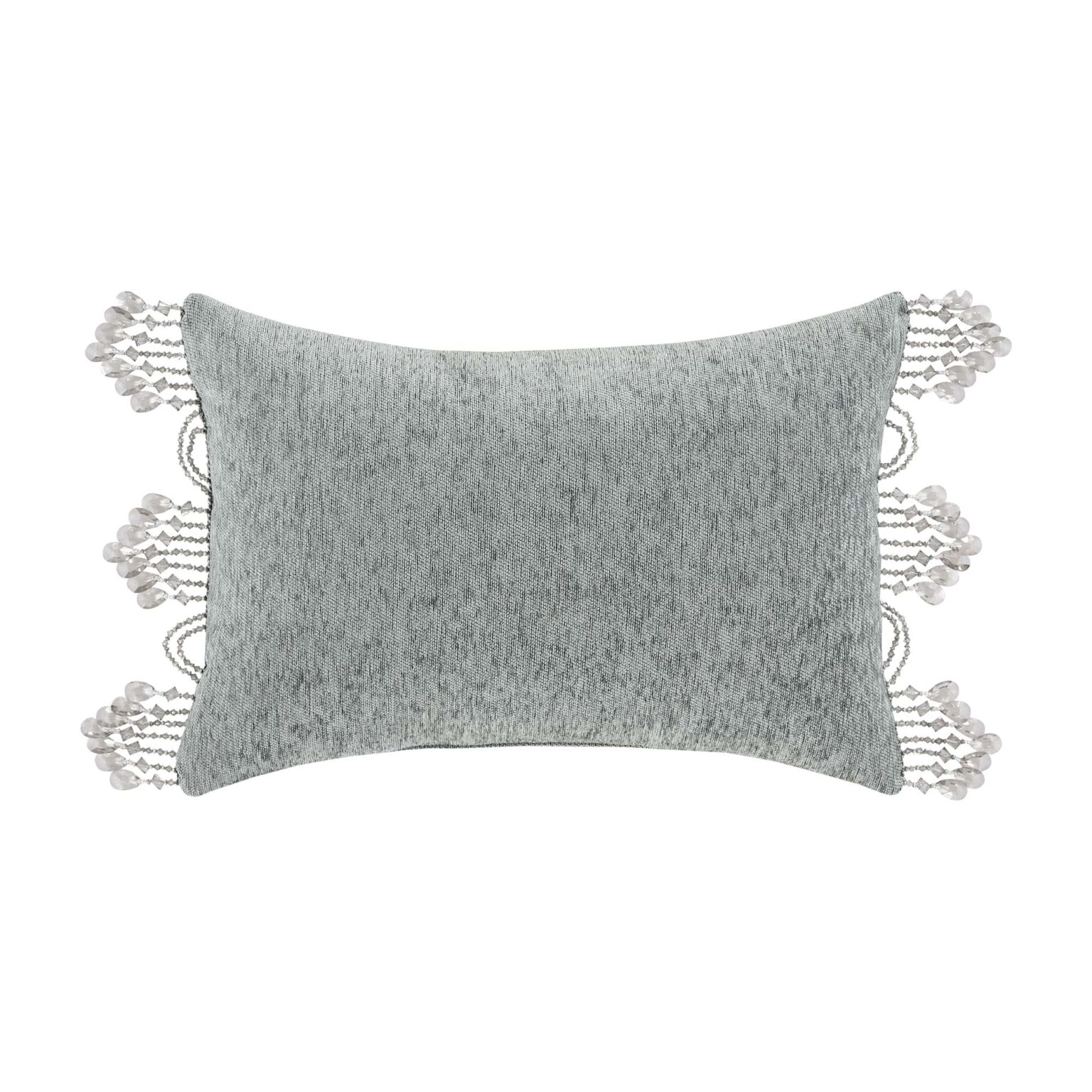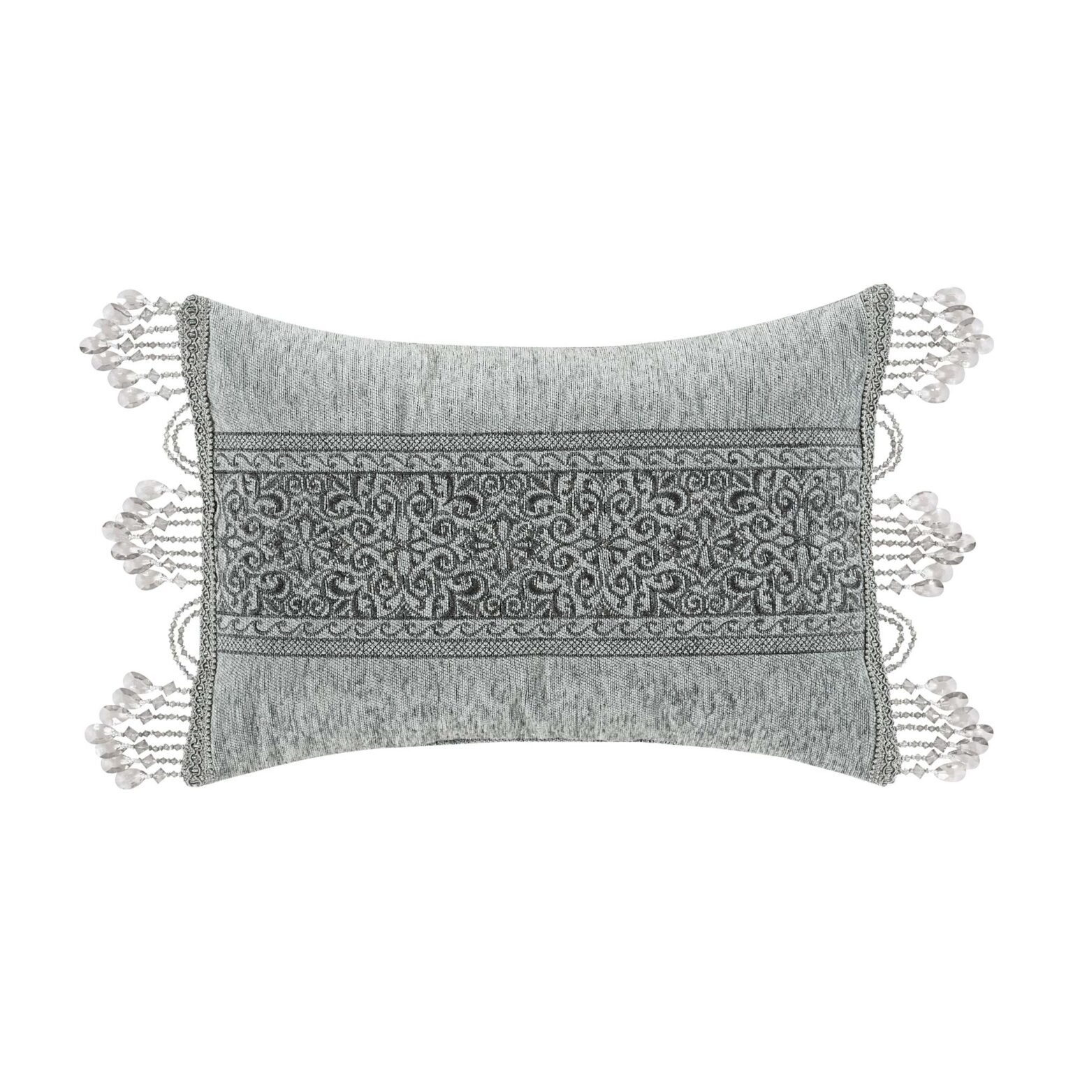 The Stunning Tiana Boudoir Pillow Is Beautifully Embroidered With A Silver Thread On An Ice Blue Design-House Quality Chenille Fabric. This Decadent Pillow Is Embellished With A Sparkling Crystal Tassel Fringe And Braided Gimp To Add A Traditional Luxury Look To Your Bedroom Decor. Pair This Luxurious Accent Pillow With Tiana Bedding Set By JQueen NY For A Touch Of Opulence.