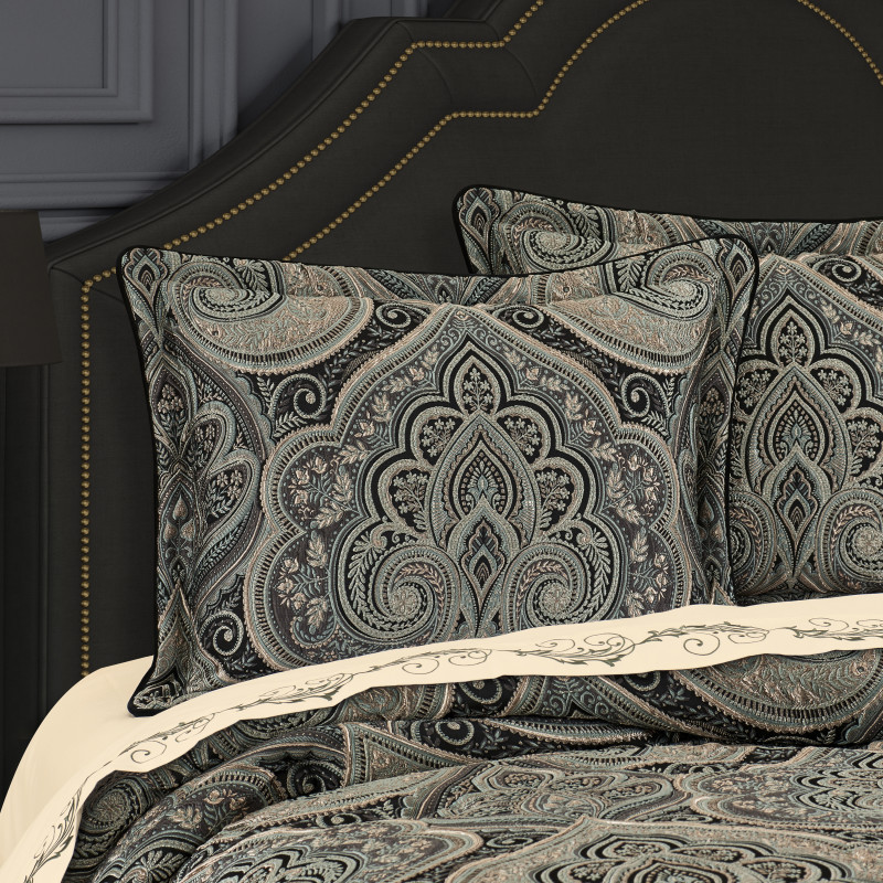 Refined elegance is seen throughout the highly detailed vincenzo 4 piece comforter set. Designed with a traditional woven damask design with a sophisticated color pallete. The colors range from black, pewter, metallic gold and teal, creating a brilliant harmony of modern and traditional. A small black velvet piping finishes the lofty and oversized comforter and the two padded pillow shams, with a split-corner bedskirt, beautifully complete the set. Pair this bedding collection with the vincenzo throw pillows, euros, and window treatments to add fine layered luxury to your bedroom.