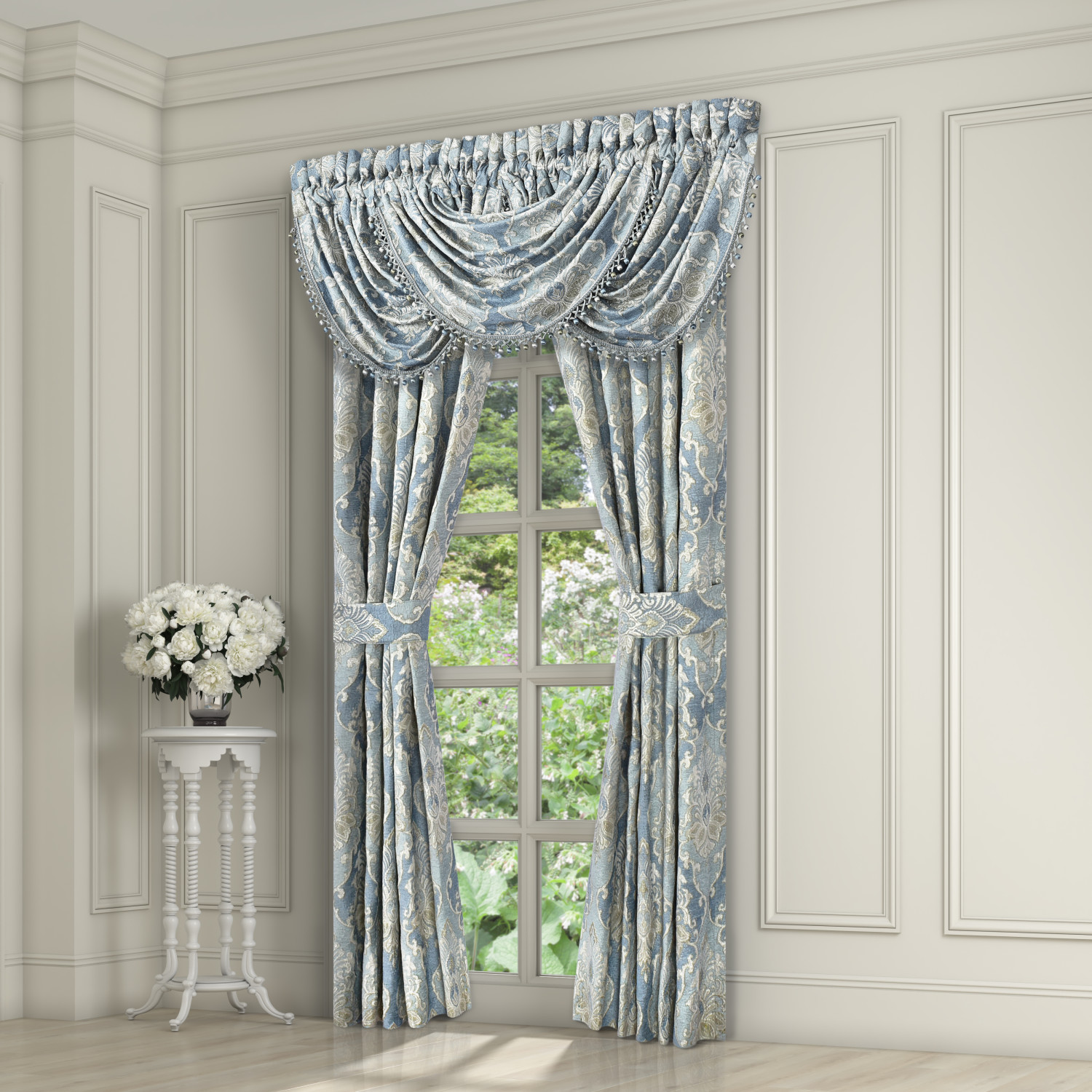 The Celtic Comforter Set showcases a stunning traditional woven chenille damask, featuring an intricately designed pattern for timeless elegance. The soft spa blue tones add a serene and sophisticated accent to any bedroom décor.