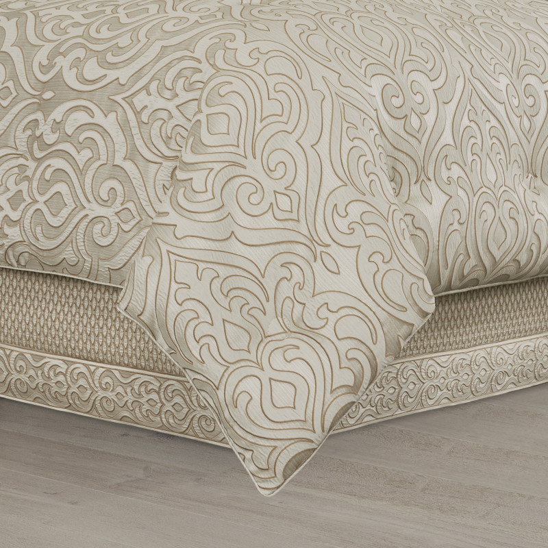Each pillow sham is meticulously cut and sewn to center the pattern perfectly, while the bed skirt is carefully crafted with kick pleats and a scroll border to add a luxurious, tailored finish. Complete the ensemble with the Lazlo throw pillows, Euros, and window treatments for a full, refined bedroom look.
