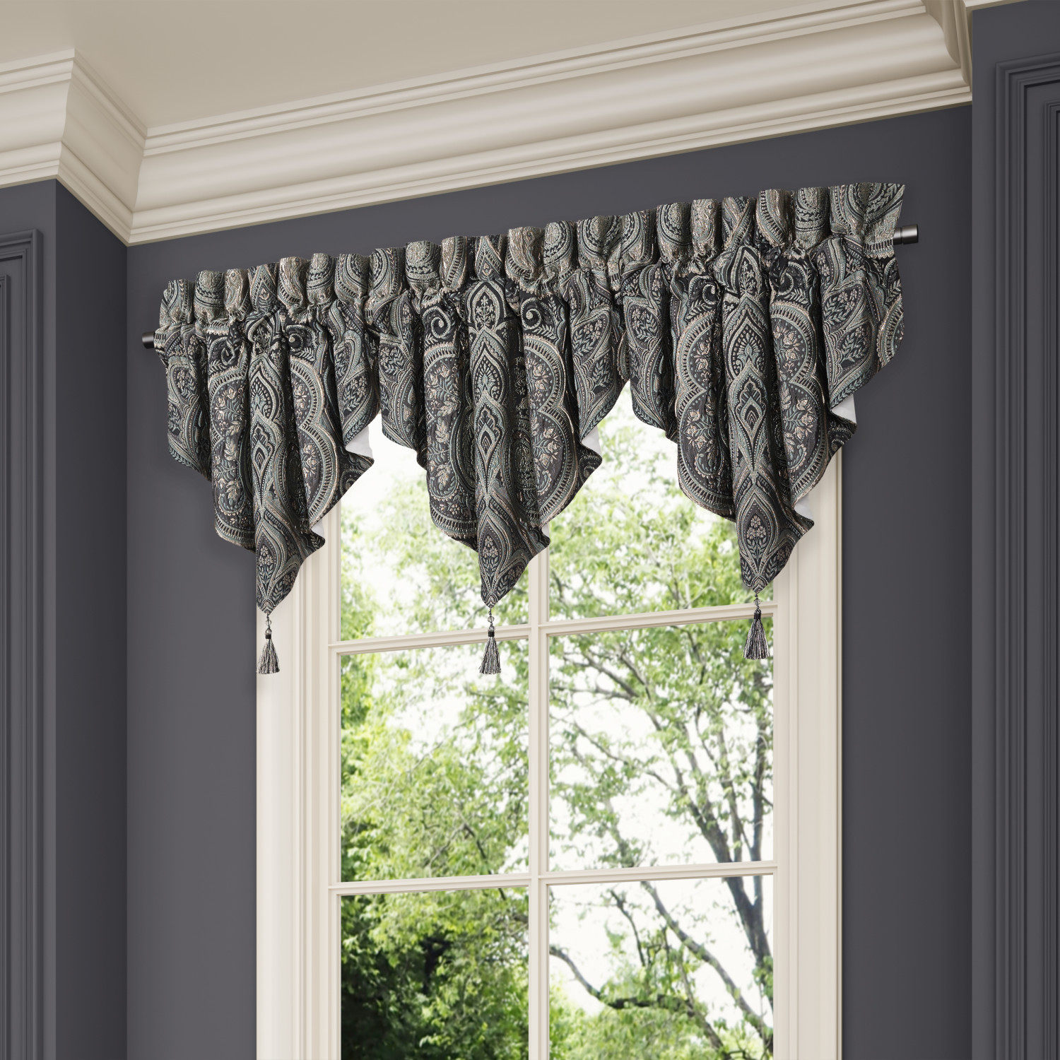 The Vincenzo Ascot Window Valance is crafted with a framed woven damask in sophisticated tones of black, pewter, metallic gold, and teal. Each valance is finished with a detailed, multi-colored tassel trim in black, teal, pewter, and gold for a luxurious accent.